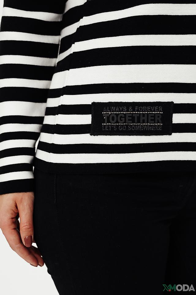 Этот стильный пуловер от Monari станет отличным дополнением к вашему гардеробу. Пуловер выполнен в классической полосатой расцветке – сочетание чёрного и белого цветов делает его универсальным и легко сочетаемым с другими вещами.