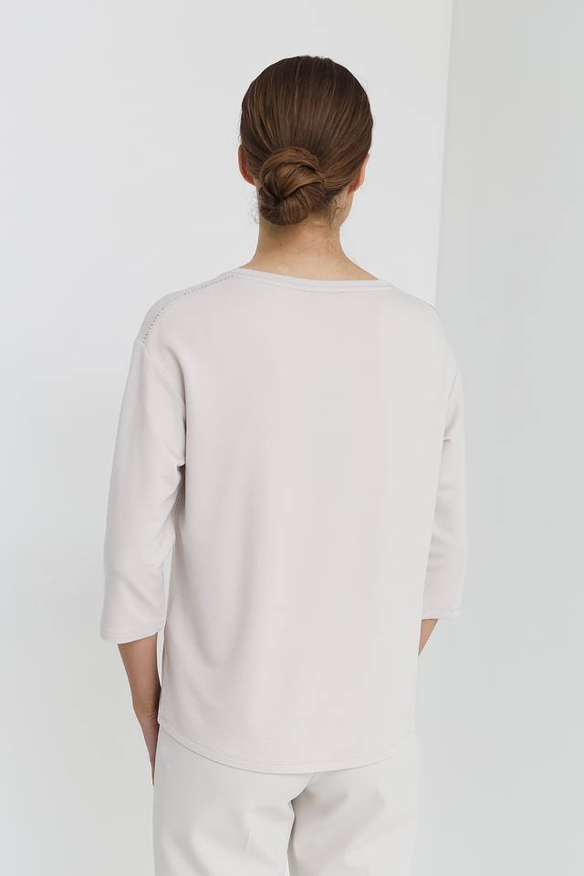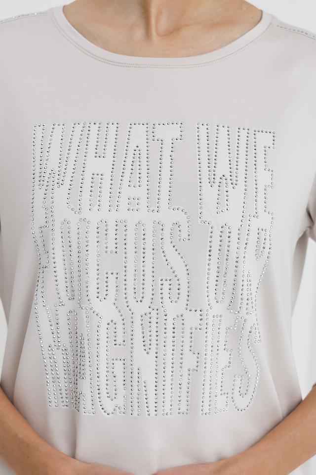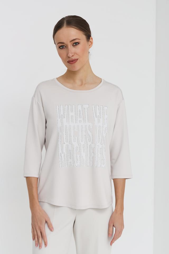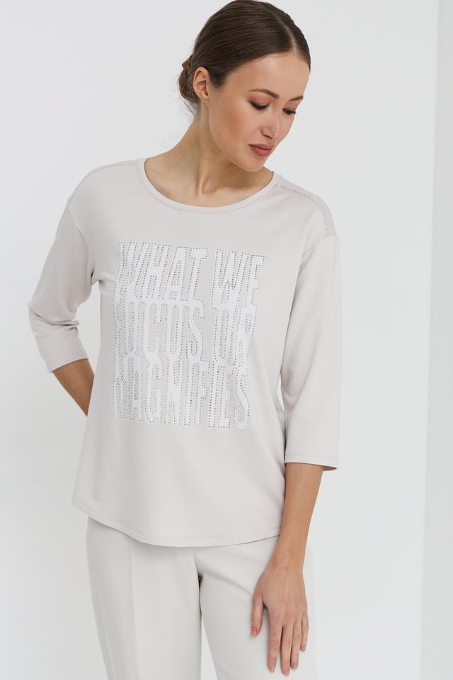Женский лонгслив Monari светло-серого цвета с эффектным принтом "WHAT WE FOCUS ON MAGNIFIES". Модель выполнена из мягкой и приятной к телу ткани с добавлением вискозы и модала, обеспечивающей комфорт в носке. Состав: вискоза 45%, модал 45%, эластан 10%