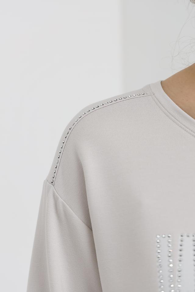 Лонгслив имеет прямой крой и 3/4 рукава, что делает его универсальным для различных образов. Светло-серый цвет изделия легко сочетается с другими элементами одежды, а яркий белый принт с надписью "WHAT WE FOCUS ON MAGNIFIES" добавляет образу индивидуальности.