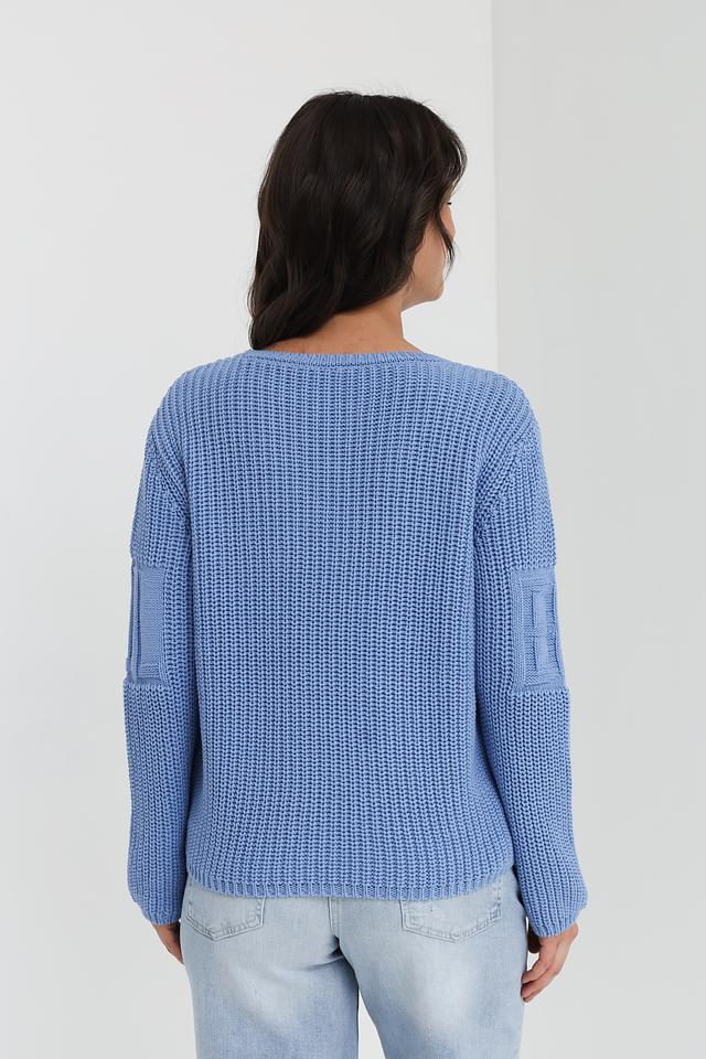 Голубой пуловер от Monari – это стильная и комфортная модель из 100% хлопка. Пуловер имеет объёмный крой и декор в виде кос на плечах и рукавах, что придает ему оригинальность. Состав: хлопок 100%