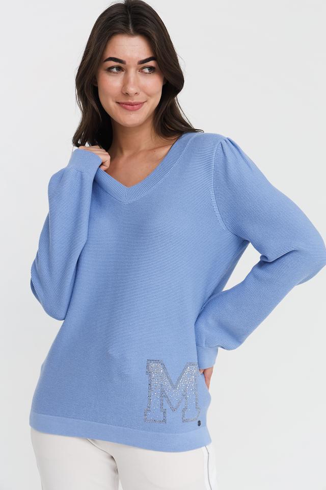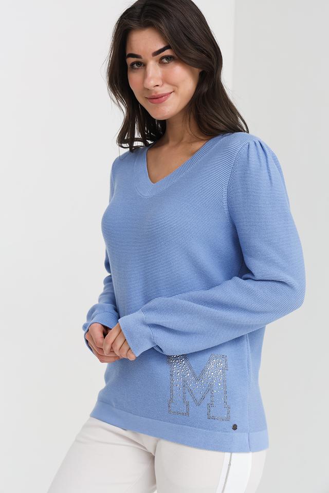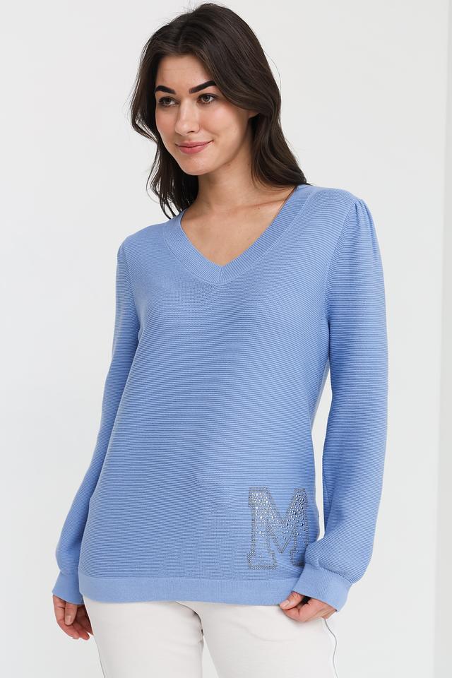 Женский пуловер Monari голубого цвета с V-образным вырезом и декоративной отделкой в виде логотипа с кристаллами. Изготовлен из мягкого хлопка, обеспечивающего комфорт в носке. Состав: хлопок 100%
