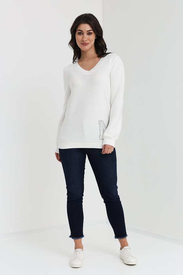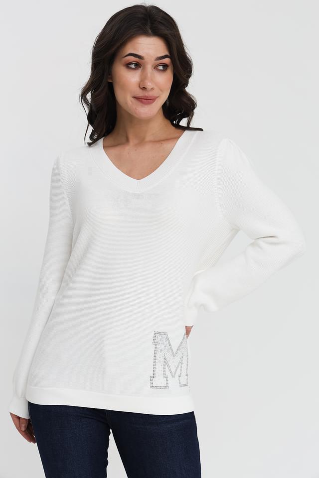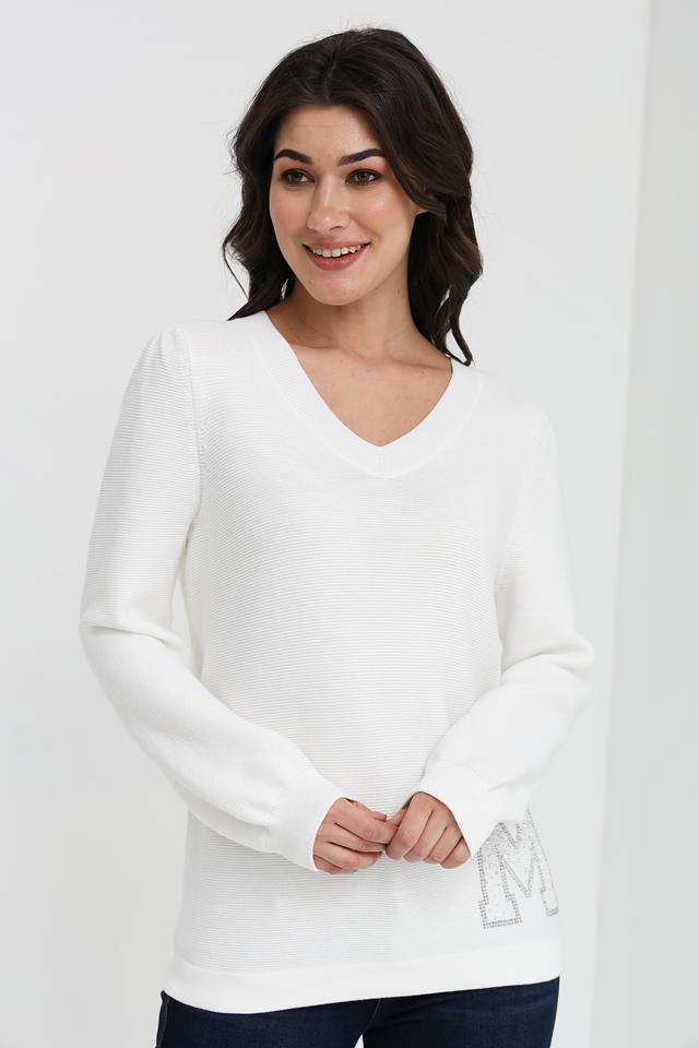 Белый пуловер Monari с V-образным вырезом украшен мерцающим логотипом. Изготовлен из мягкого хлопка, обеспечивающего комфорт и удобство в носке. Идеальный выбор для создания стильного повседневного образа. Состав: хлопок 100%