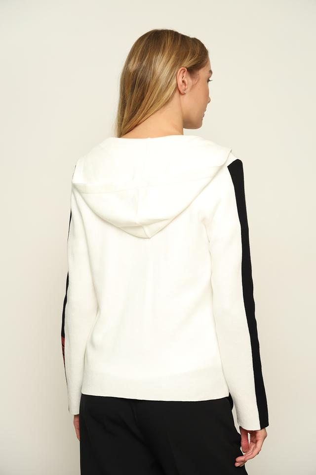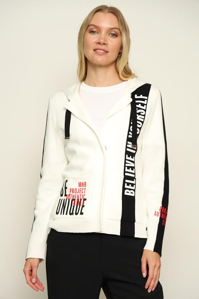 Белый жакет Monari с оригинальным дизайном и надписями станет ярким акцентом вашего образа. Модель с капюшоном и черными вставками отличается стильным кроем и высоким качеством исполнения. Состав: хлопок 100%