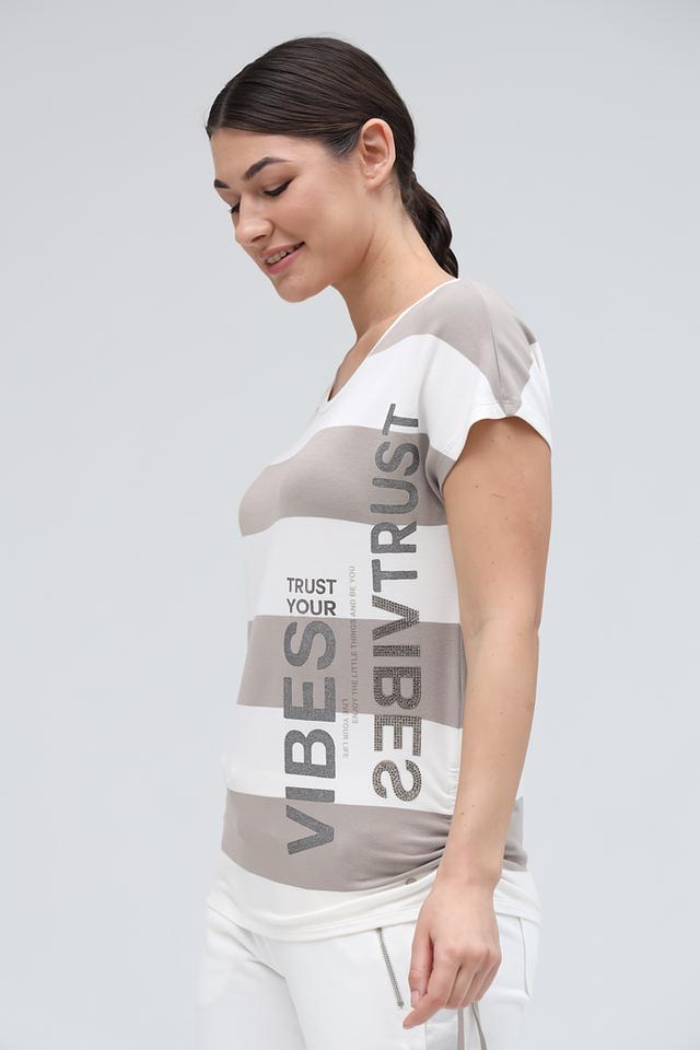 Женская футболка Monari бежевого и белого цвета с ярким принтом и короткими рукавами. Стильная модель из мягкого трикотажа станет отличным дополнением к вашему образу. Состав: вискоза 45%, модал 45%, эластан 10%