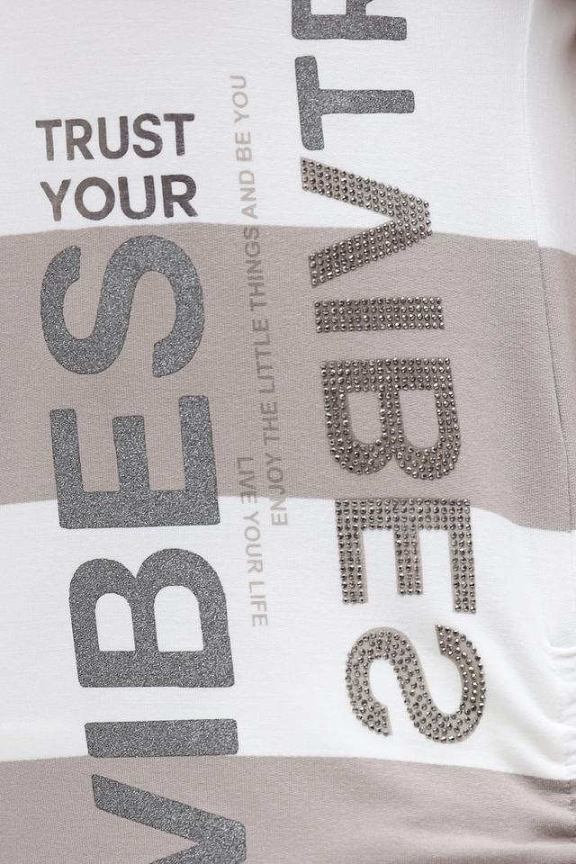 Передняя часть футболки украшена крупным принтом с надписью "VIBES" и "TRUST YOUR". Крой футболки свободный, что обеспечивает комфорт в носке. Вырез горловины округлый, а короткие рукава делают ее подходящей для теплой погоды.