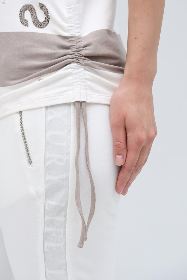 Эта футболка от Monari – идеальный выбор для создания комфортного и стильного образа. Модель выполнена в бежевом и белом цвете с широкими горизонтальными полосами.