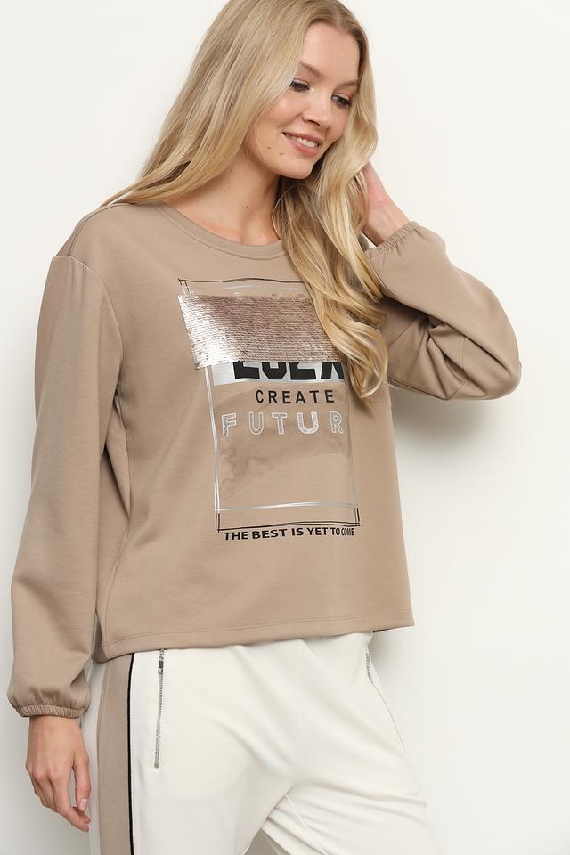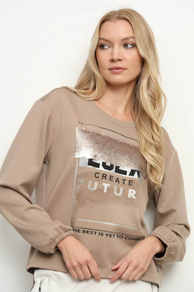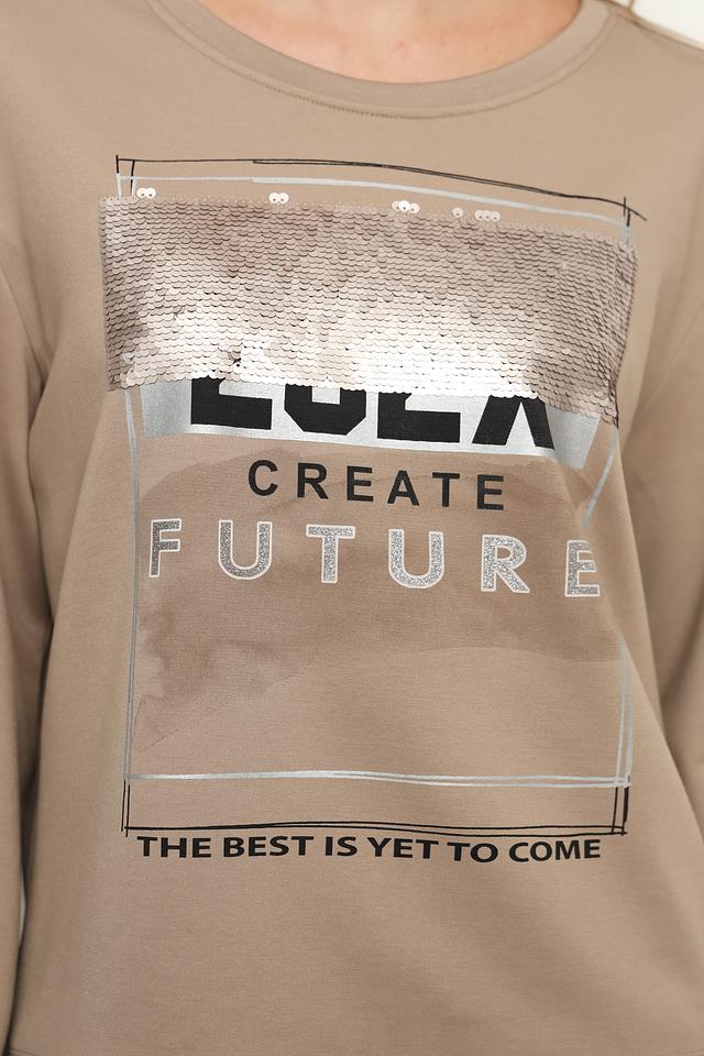 Толстовка имеет бежевый цвет и украшена ярким принтом с надписью "LOLA CREATE FUTURE" и графическим изображением. Округлый вырез горловины и длинные рукава с манжетами придают ей классический вид. Свободный крой обеспечивает удобную посадку по фигуре.