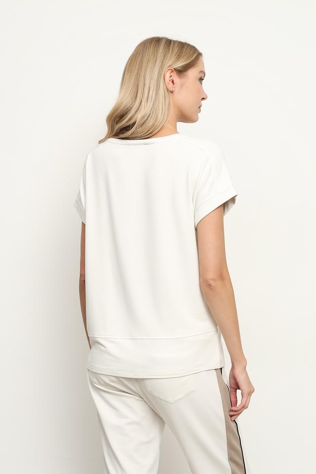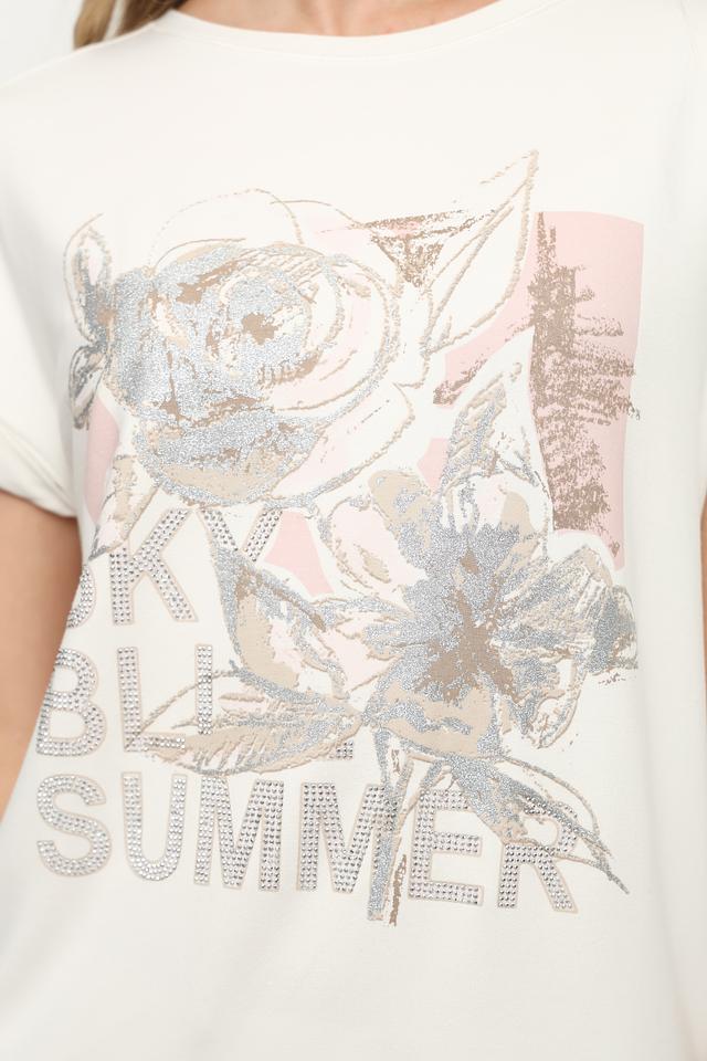 Эта стильная футболка от Monari станет незаменимой вещью в вашем летнем гардеробе. Футболка выполнена в кремовом цвете и украшена ярким цветочным принтом с надписью "SUMMER", что придает ей игривый и свежий вид.
