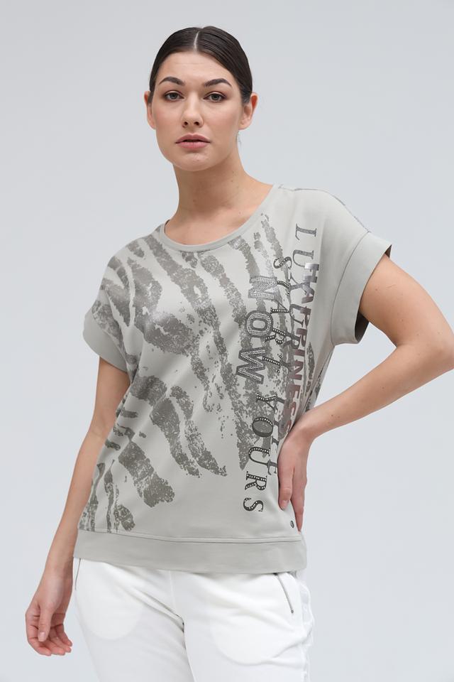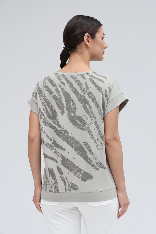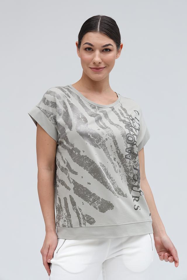 Стильная блуза Monari серого цвета с оригинальным принтом в виде зебры и декором из страз. Модель свободного кроя с короткими рукавами станет отличным дополнением к вашему образу. Состав: хлопок 82%, модал 13%, эластан 5%