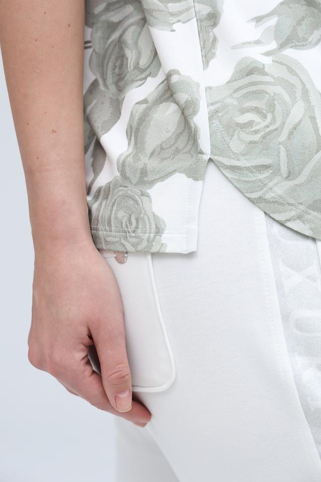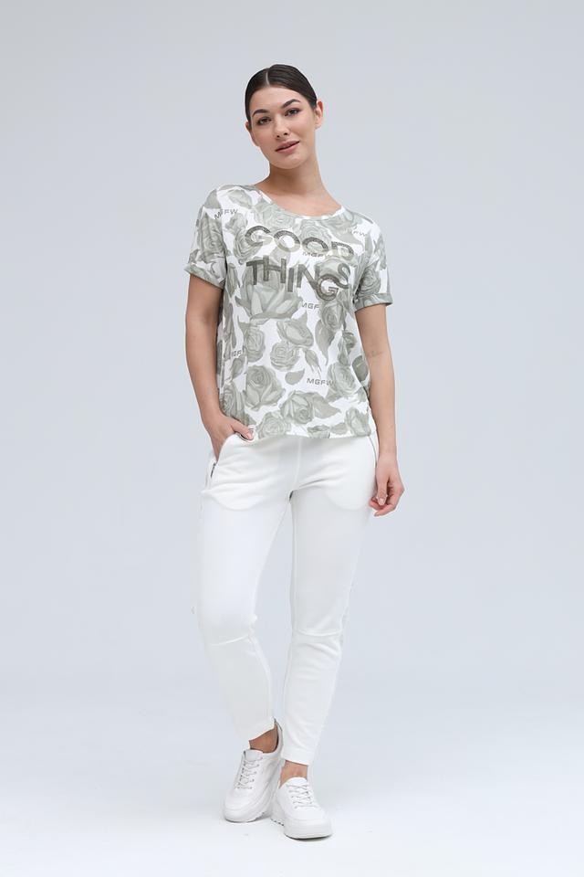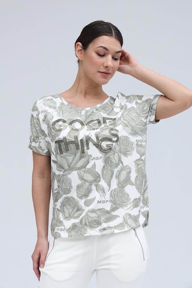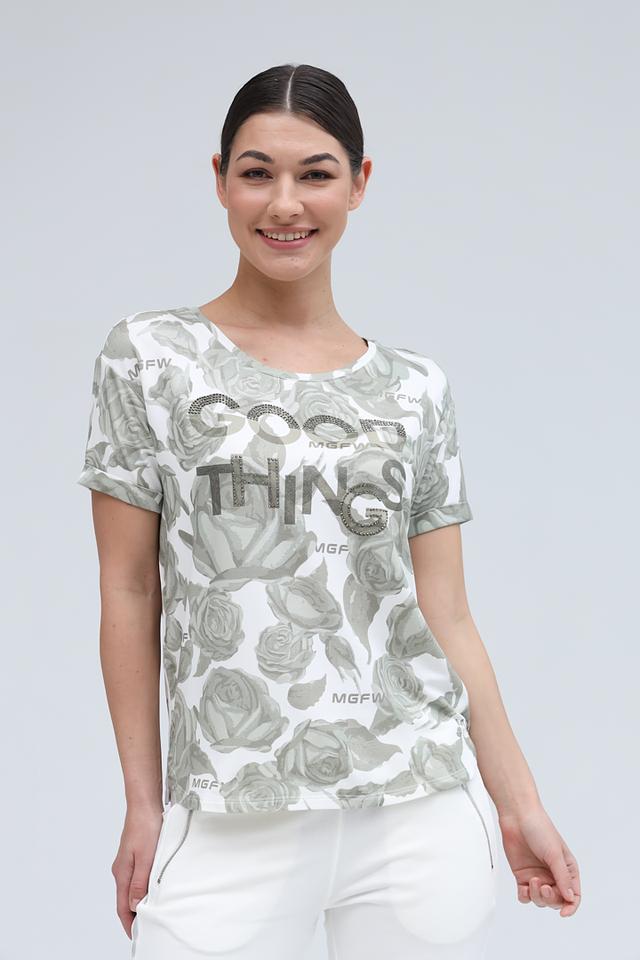 Стильная блуза Monari светло-зелёного цвета с цветочным принтом и декором из страз. Модель выполнена из мягкой и приятной к телу ткани, идеально подходит для создания повседневных и вечерних образов. Состав: вискоза 45%, модал 45%, эластан 10%