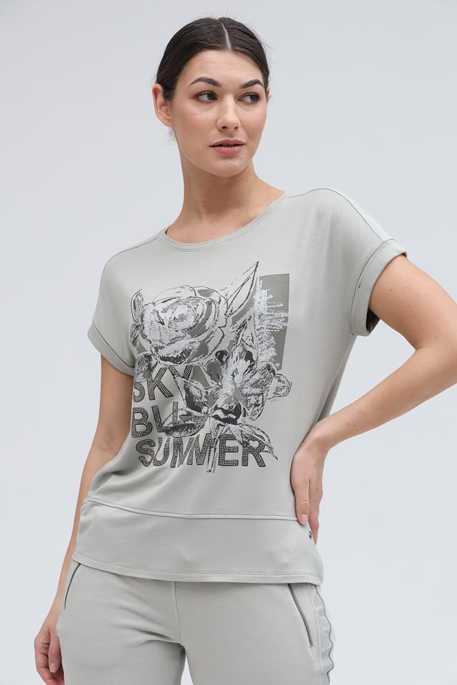 Женская футболка Monari серого цвета с оригинальным принтом. Модель выполнена из мягкого и приятного к телу трикотажа, обеспечивающего комфорт в носке. Футболка станет отличным дополнением к вашему повседневному гардеробу. Состав: вискоза 45%, модал 45%, эластан 10%