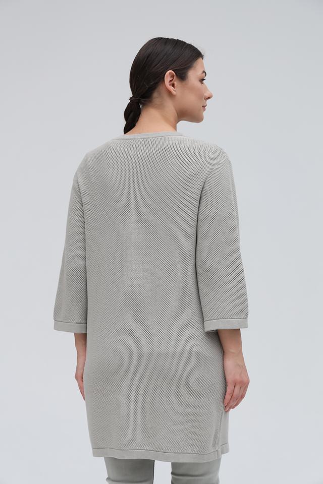 Жакет имеет прямой крой, длину до середины бедра и рукава три четверти. Модель дополнена двумя накладными карманами. Отсутствие застежек делает его легким и удобным в носке.