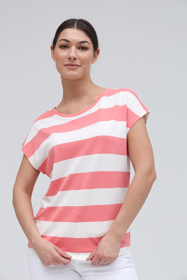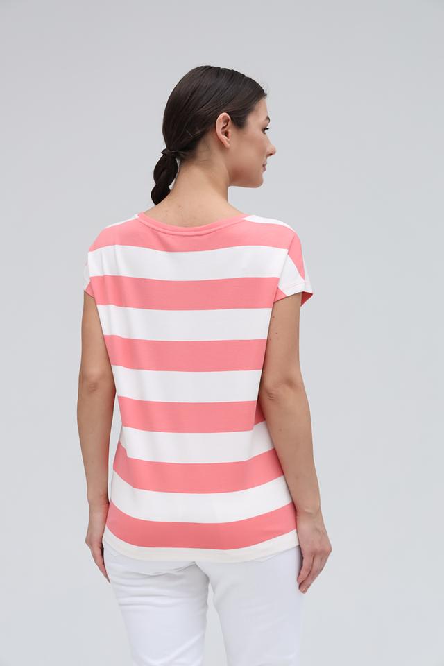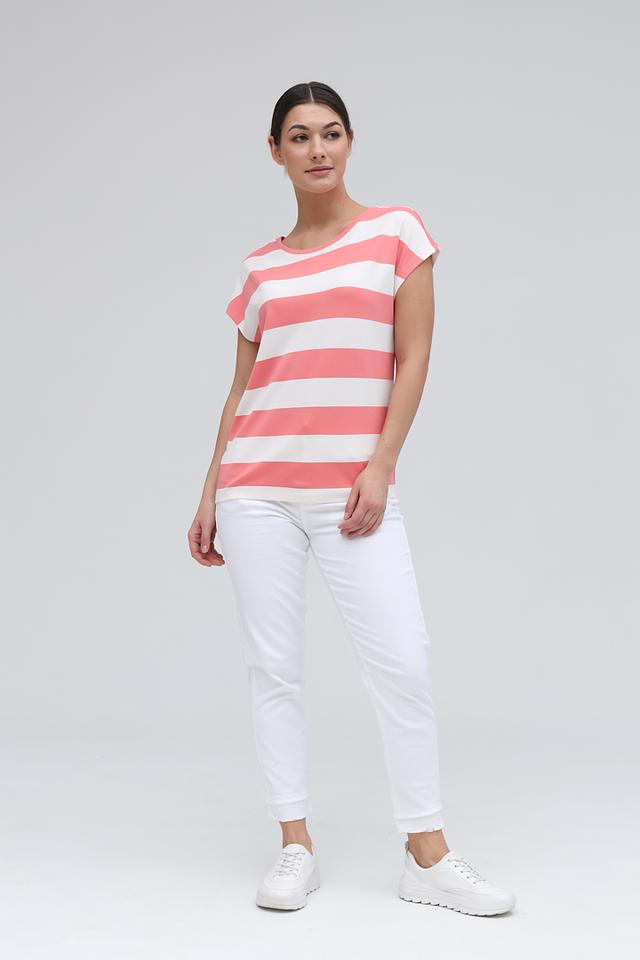 Основной цвет футболки – нежно-коралловый, дополненный широкими белыми полосками. Такое сочетание цветов выглядит свежо и актуально. Футболка хорошо сочетается с джинсами, брюками или юбками, позволяя создавать разнообразные образы.