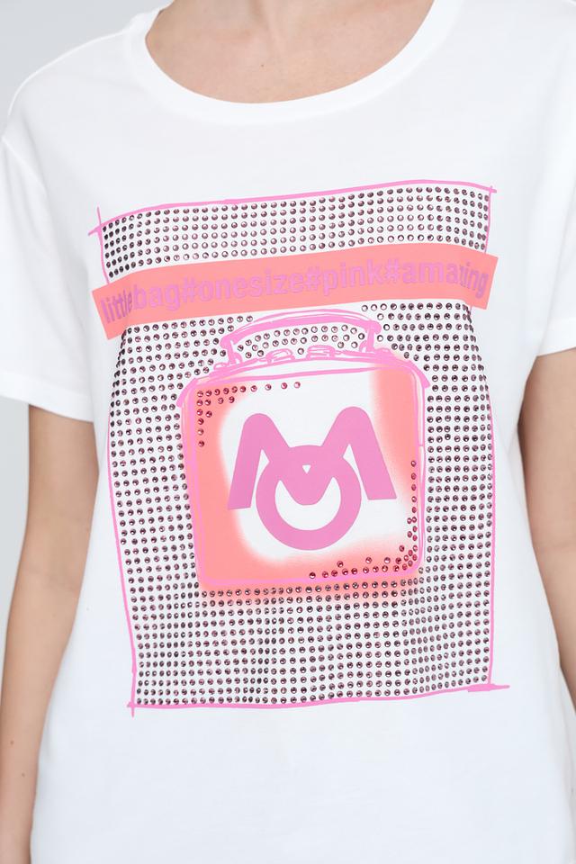 Особенностью данной модели является яркий принт на лицевой стороне, выполненный в розовых и белых тонах. Принт представляет собой графический рисунок с логотипом бренда, обрамленный декоративной сеткой с блестками.
