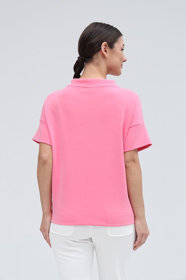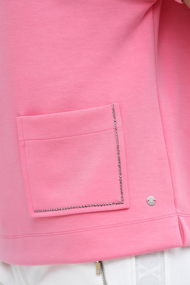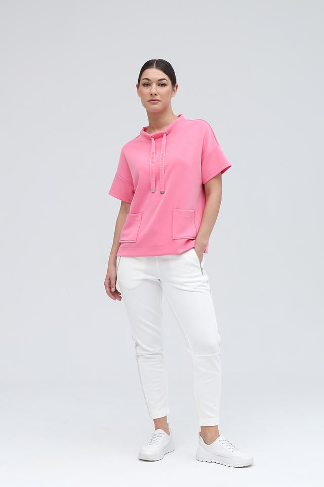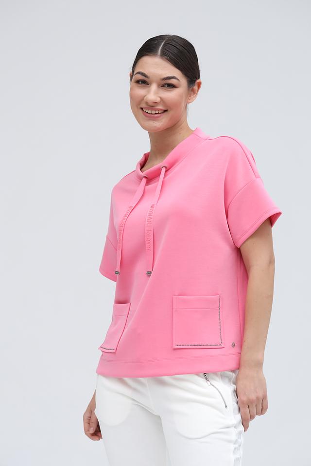 Розовый джемпер Monari с коротким рукавом и капюшоном на шнурках. Модель выполнена из мягкого трикотажа с накладным карманом и декором в виде логотипа бренда. Удобный и стильный выбор для повседневного образа. Состав: модал 55%, полиэстер 40%, эластан 5%