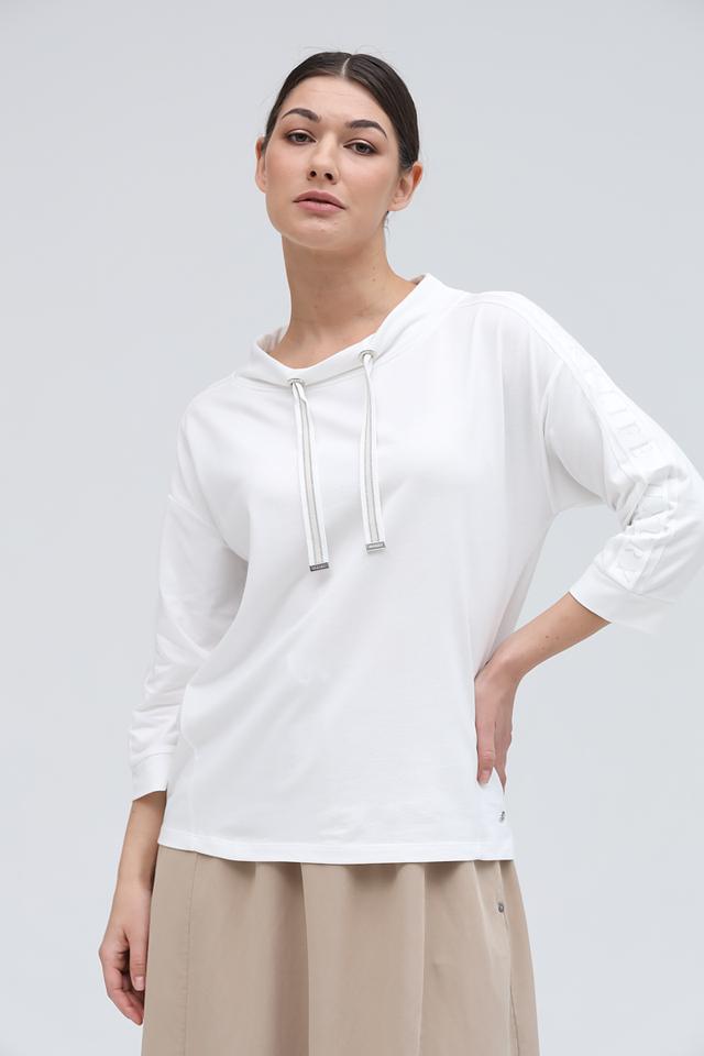 Белый джемпер от Monari с капюшоном и шнурками – стильная и комфортная модель на каждый день. Удлиненный рукав 3/4 и лаконичный дизайн делают этот джемпер универсальным элементом гардероба. Состав: хлопок 50%, модал 50%