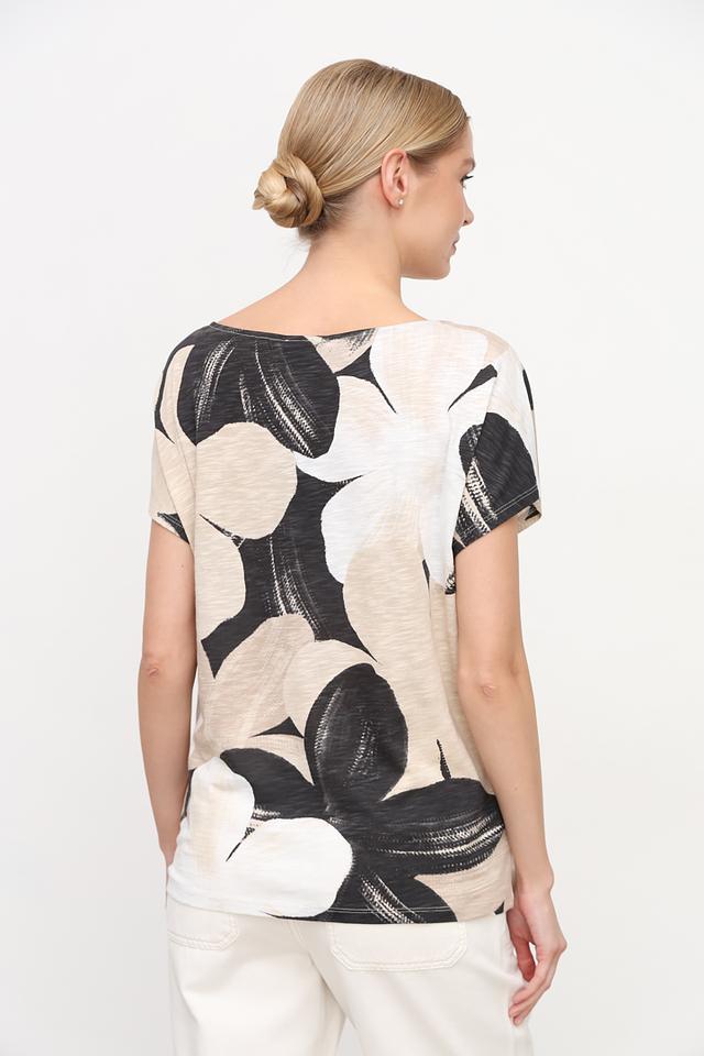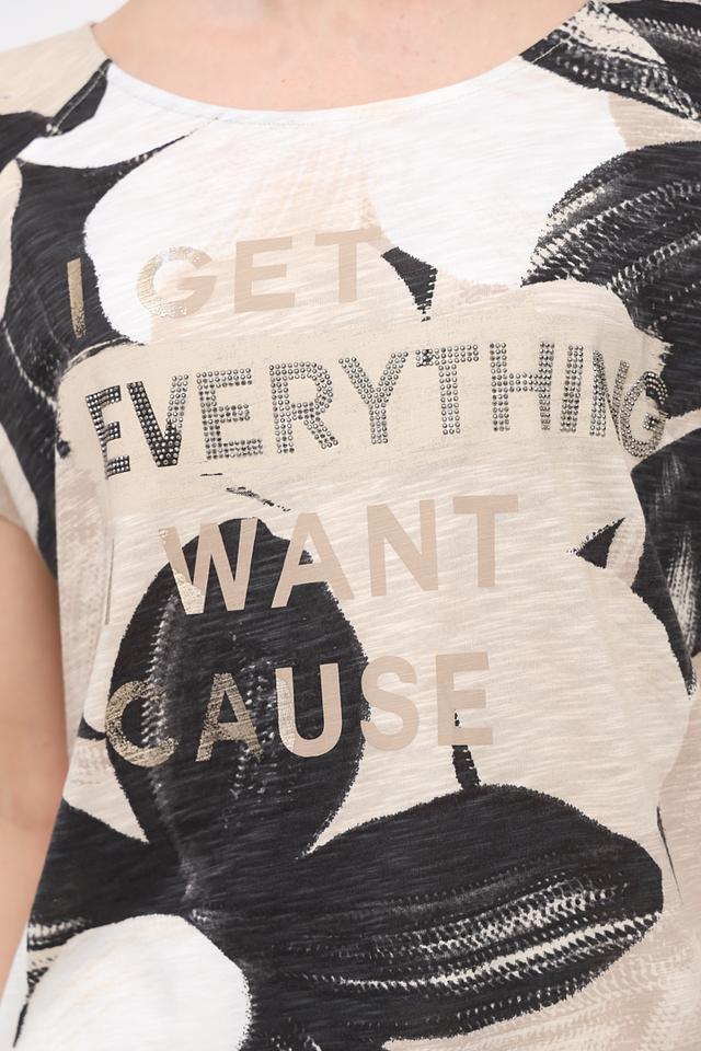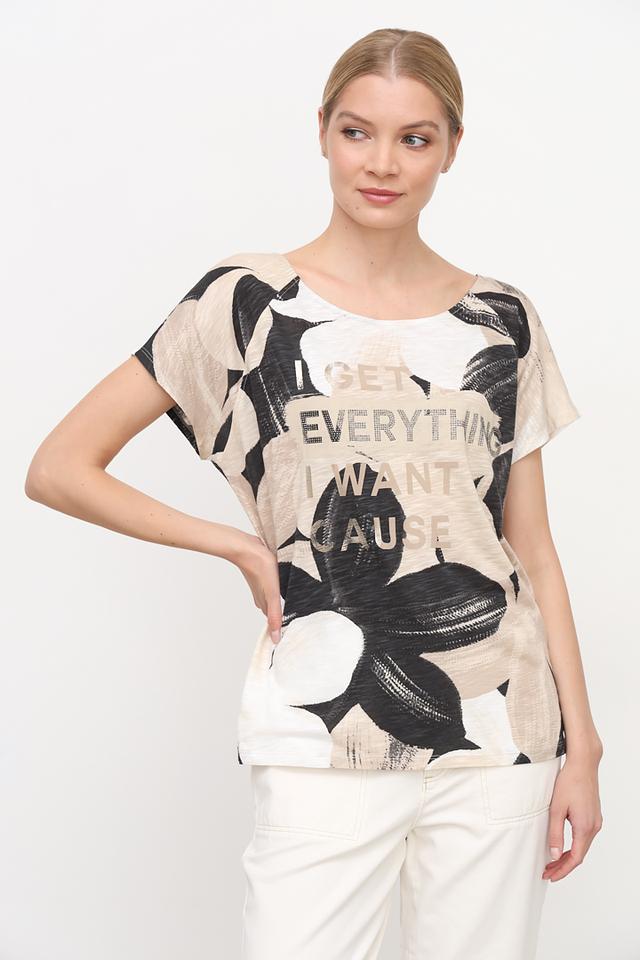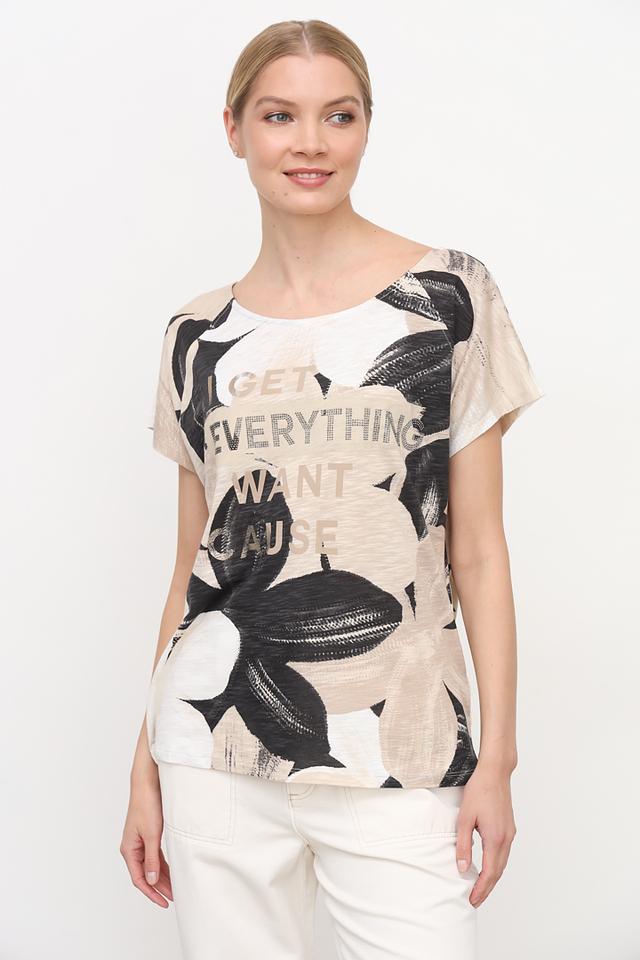 Женская футболка Monari бежевого цвета с оригинальным принтом и надписью. Модель выполнена из мягкого хлопка с модалом, обеспечивающего комфорт и приятные ощущения при носке. Состав: хлопок 50%, модал 50%