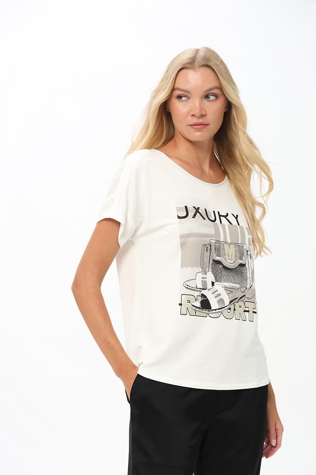 Белая футболка Monari с оригинальным принтом в виде сумки и надписей. Изготовлена из мягкой и приятной к телу ткани с добавлением вискозы и модала, обеспечивающей комфорт в носке. Состав: вискоза 45%, модал 45%, эластан 10%