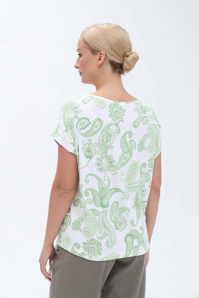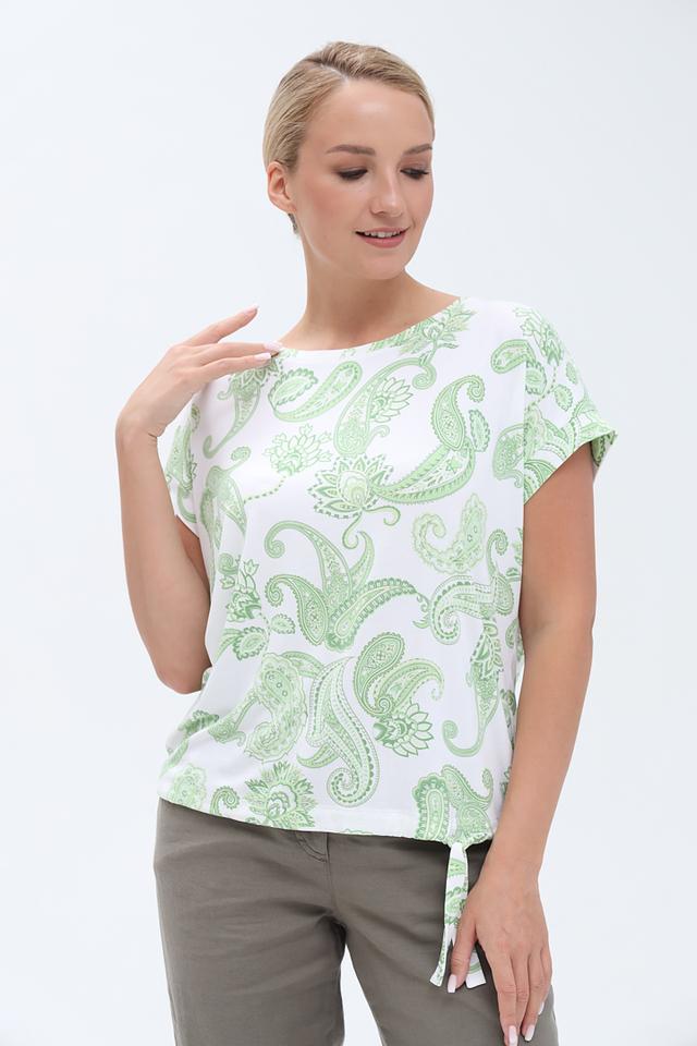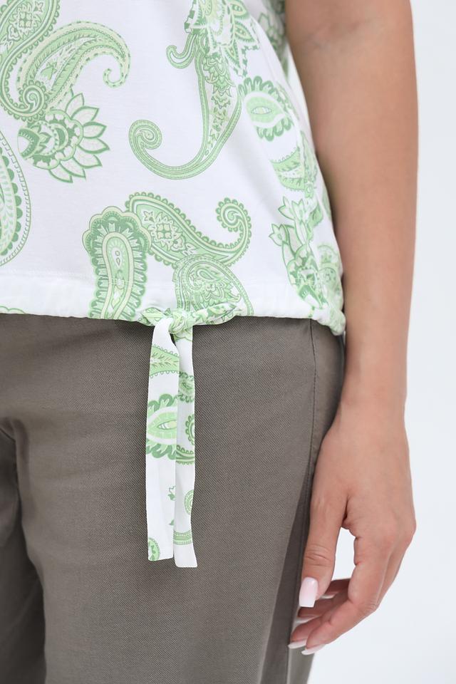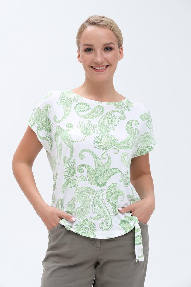 Футболка имеет свободный крой и короткие рукава, что делает ее идеальным выбором для теплой погоды. Главной особенностью модели является яркий и запоминающийся узор в нежных оттенках лайма и белого. Боковые завязки позволяют регулировать силуэт и создавать различные образы.