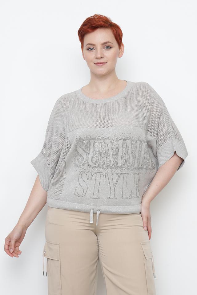 Серый пуловер Monari с ажурной вязкой и надписью "SUMMER STYLE" станет стильным дополнением к вашему гардеробу. Модель свободного кроя с короткими рукавами обеспечит комфорт и лёгкость в жаркую погоду. Состав: хлопок 85%, метализ.нить 15%