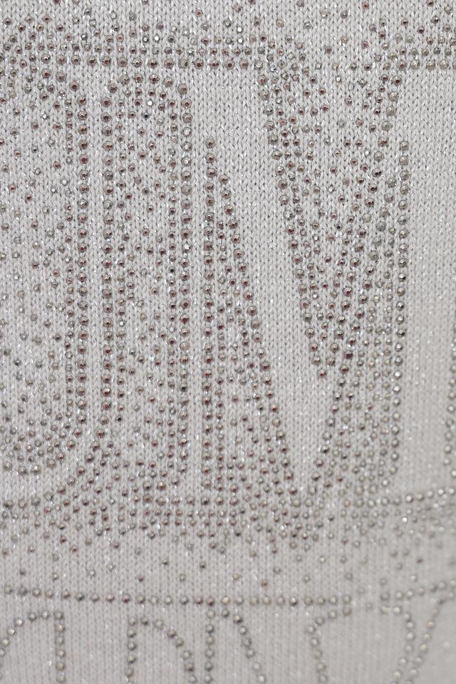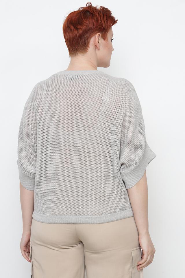 Пуловер имеет свободный крой, который не сковывает движений и обеспечивает комфортную посадку по фигуре. Короткие рукава делают его идеальным выбором для теплой погоды. Изготовлен из высококачественного хлопка с добавлением метализированной нити, что придает ему легкий блеск и изысканность.