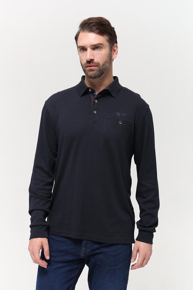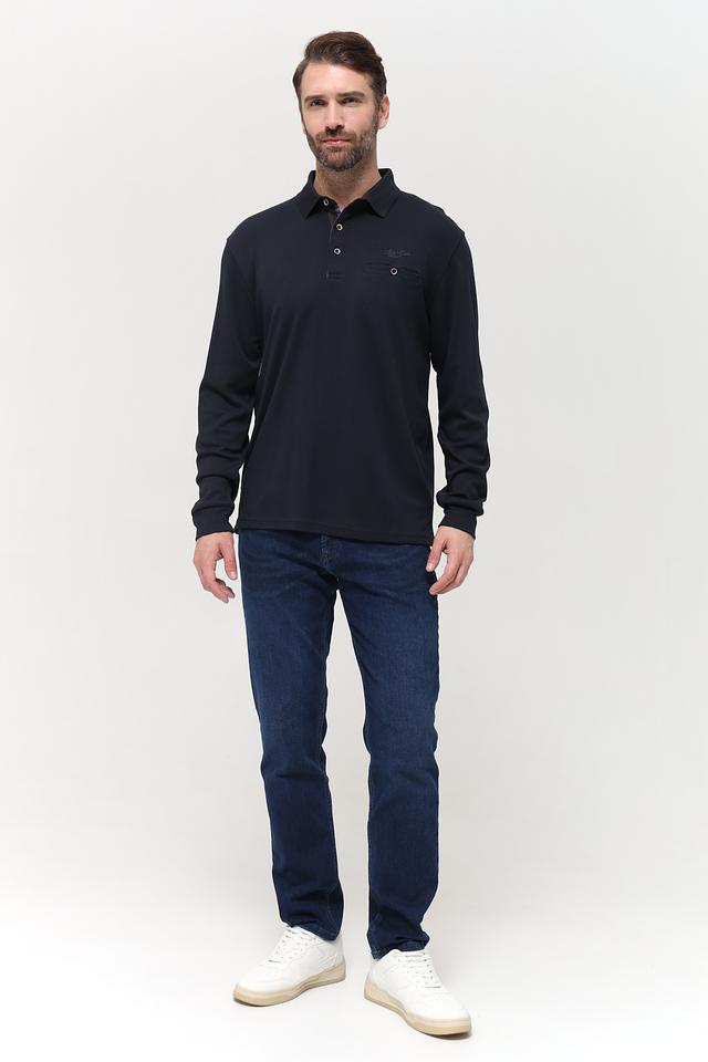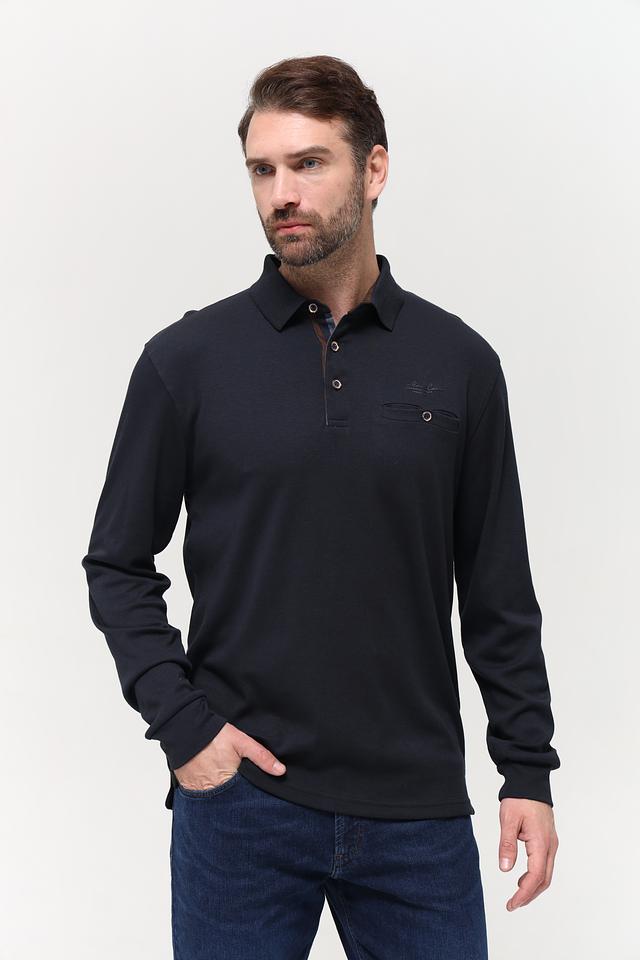 Модель выполнена в тёмно-синем цвете, который легко сочетается с различными элементами гардероба. Поло имеет классический крой с длинными рукавами, что делает его подходящим для прохладной погоды. Воротник-поло оформлен планкой с пуговицами, а на груди расположен накладной карман с логотипом бренда.