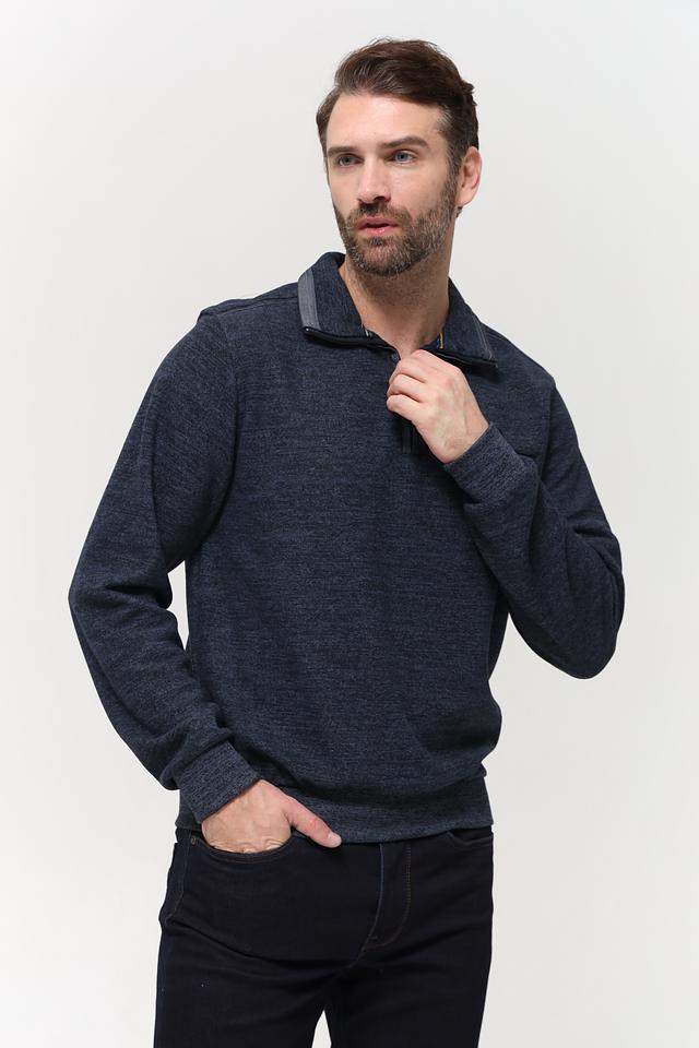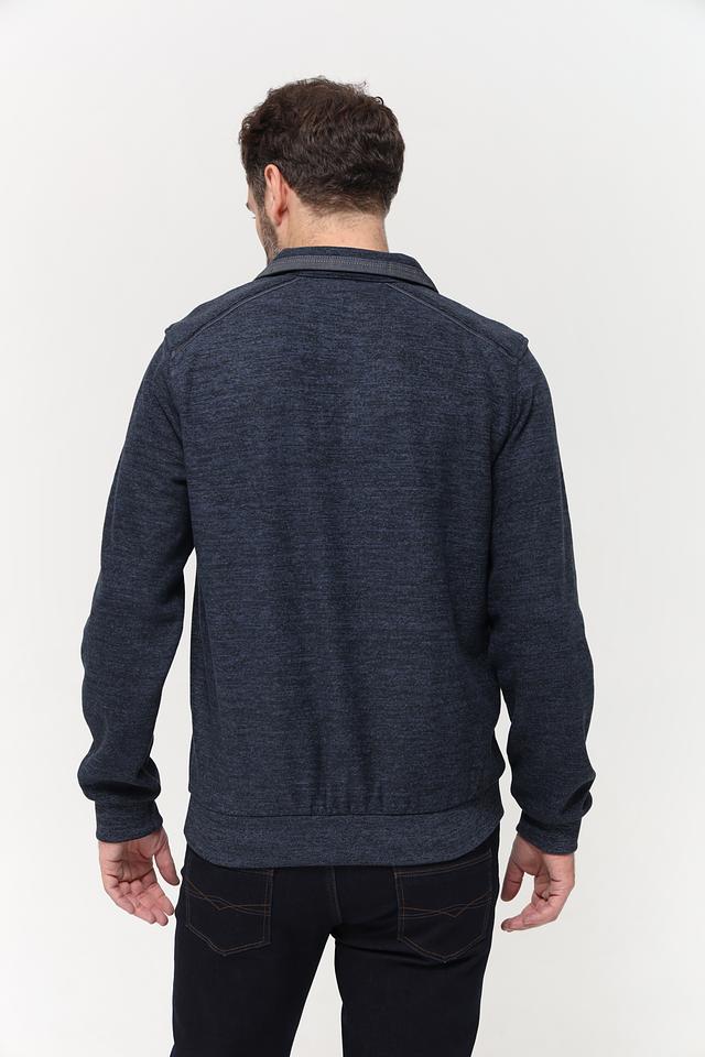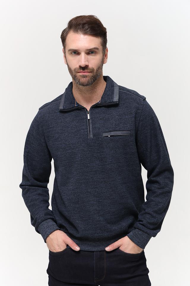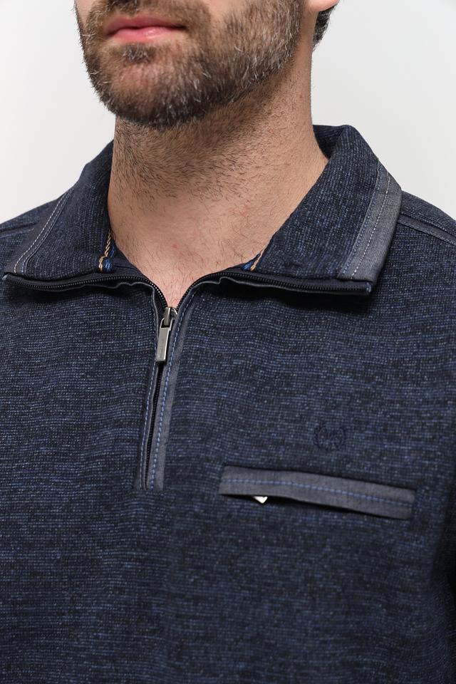 Поло имеет классический крой и тёмно-синий цвет с меланжированным эффектом. Короткая молния на горловине добавляет модели функциональности и позволяет регулировать степень открытости. На груди расположен накладной карман, который не только служит декоративным элементом, но и предоставляет дополнительное место для хранения мелких предметов.
