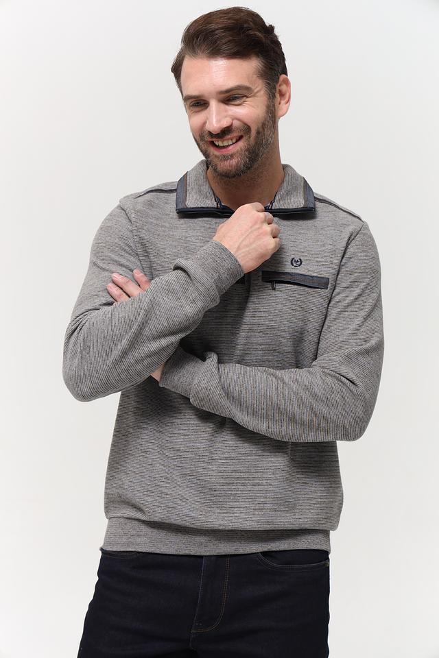 Мужской джемпер от Monte Carlo выполнен в сером цвете с текстурированным узором. Модель имеет воротник с короткой молнией и небольшим карманом на груди, декорированным логотипом бренда.