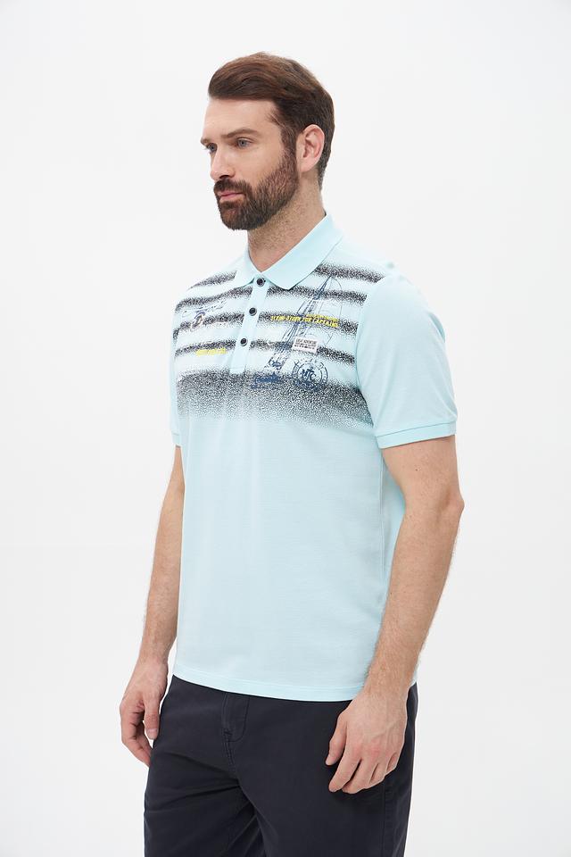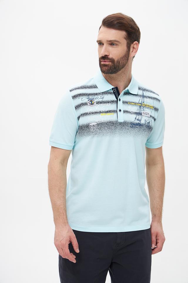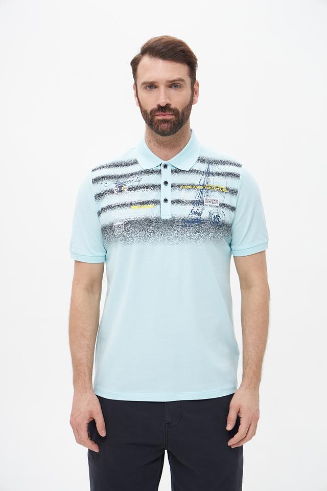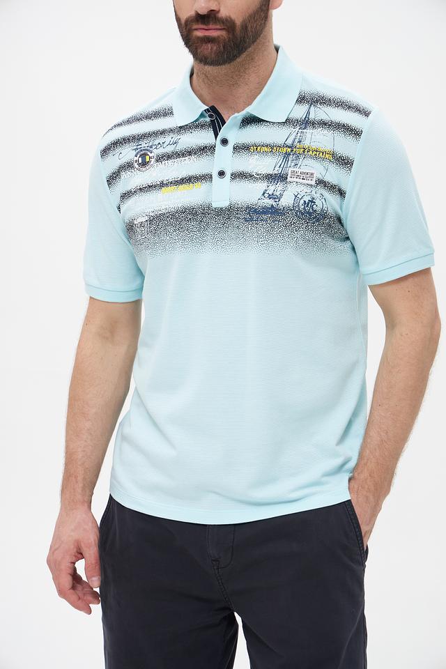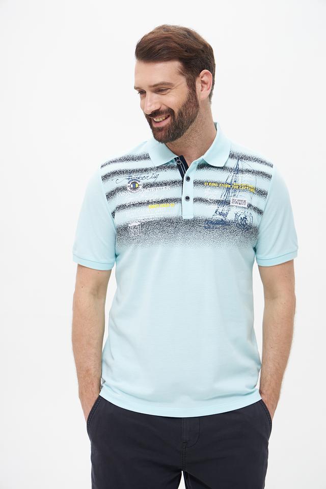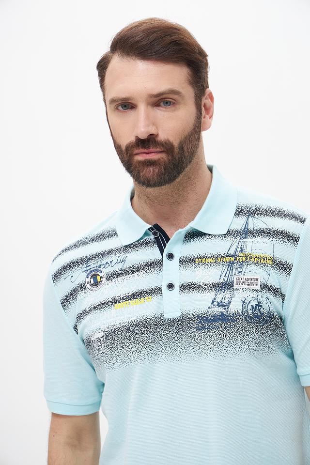 Мужское поло от Monte Carlo выполнено в светло-голубом цвете и украшено ярким принтом с изображением парусника и морских элементов. Эта модель станет отличным дополнением к вашему летнему гардеробу.