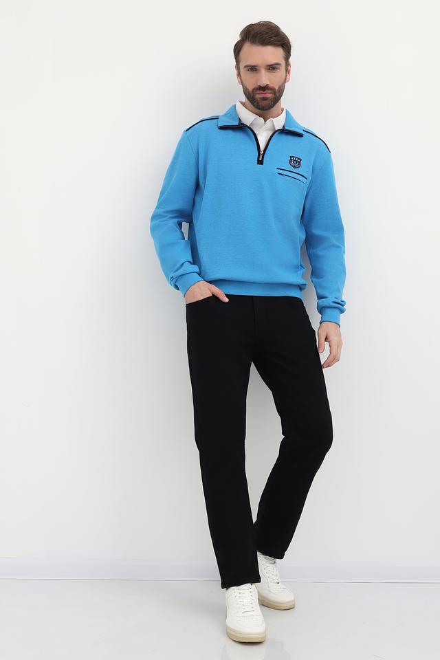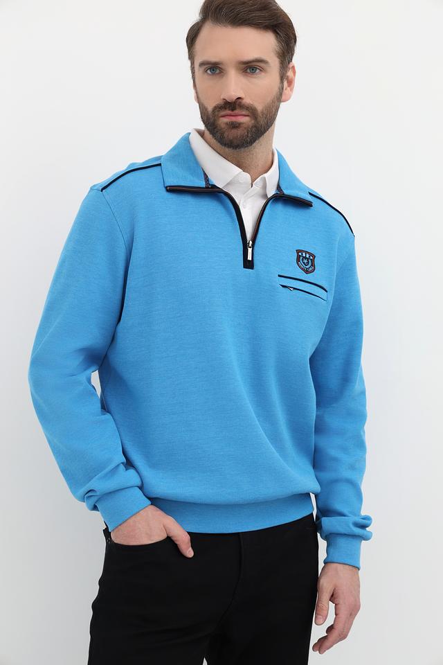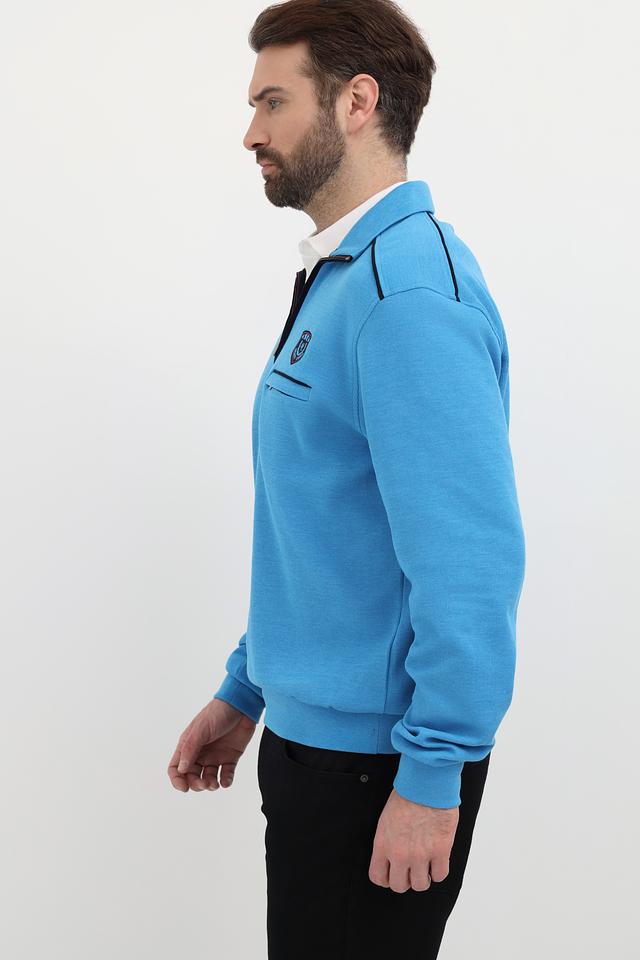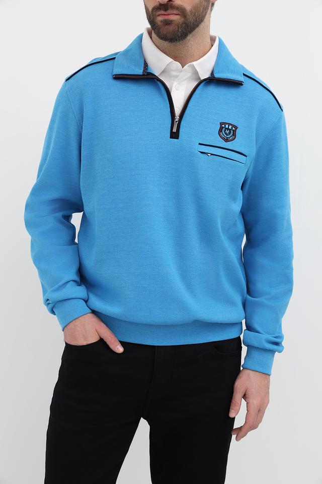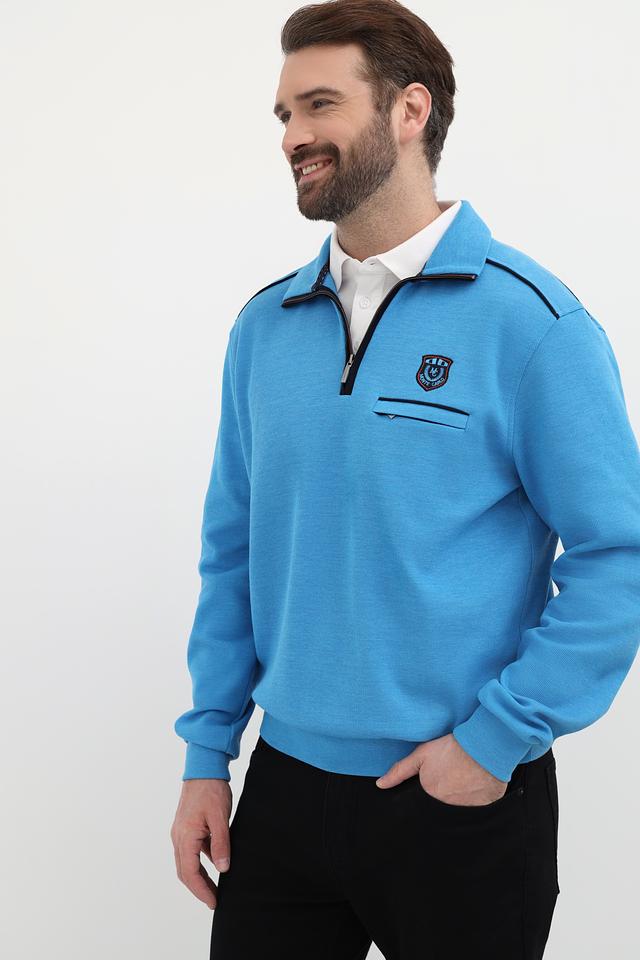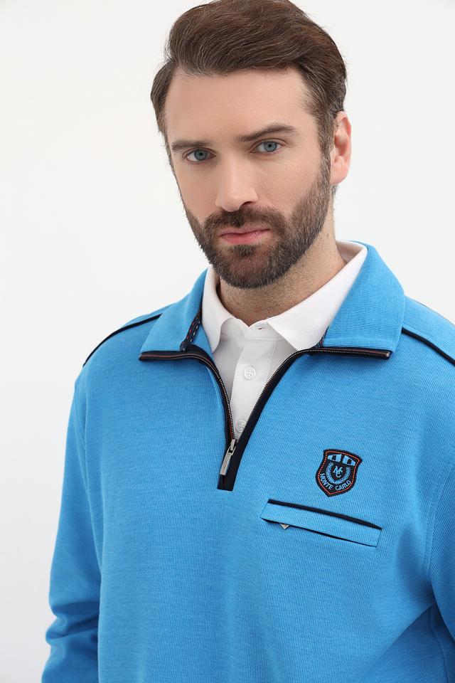 Мужской джемпер от Monte Carlo выполнен в приятном голубом цвете. Модель имеет воротник-стойку с короткой молнией, что позволяет регулировать степень защиты шеи.