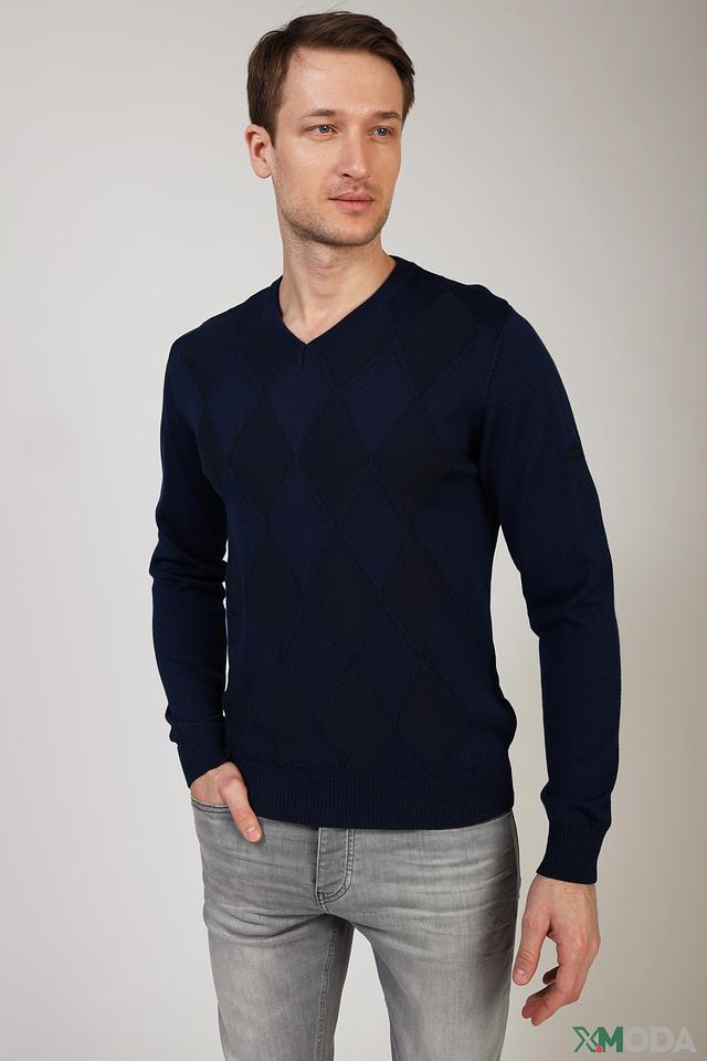 Основной акцент дизайна – ромбовидный узор, выполненный в более темном оттенке синего, что придает изделию текстурность и визуальный интерес. Джемпер имеет прямую посадку, не сковывающую движений.