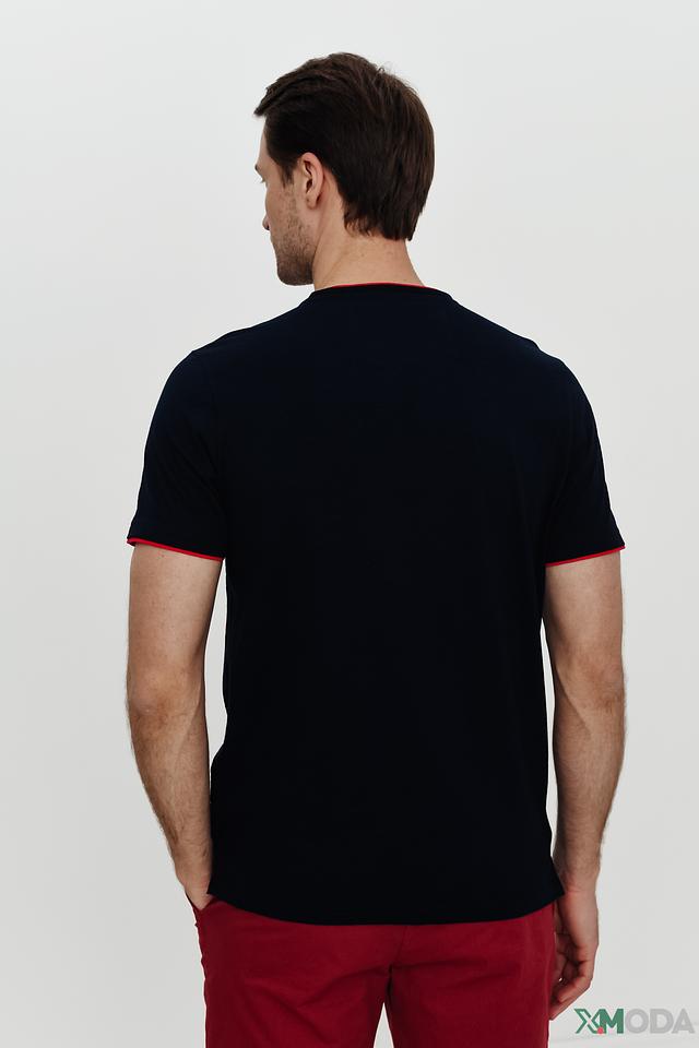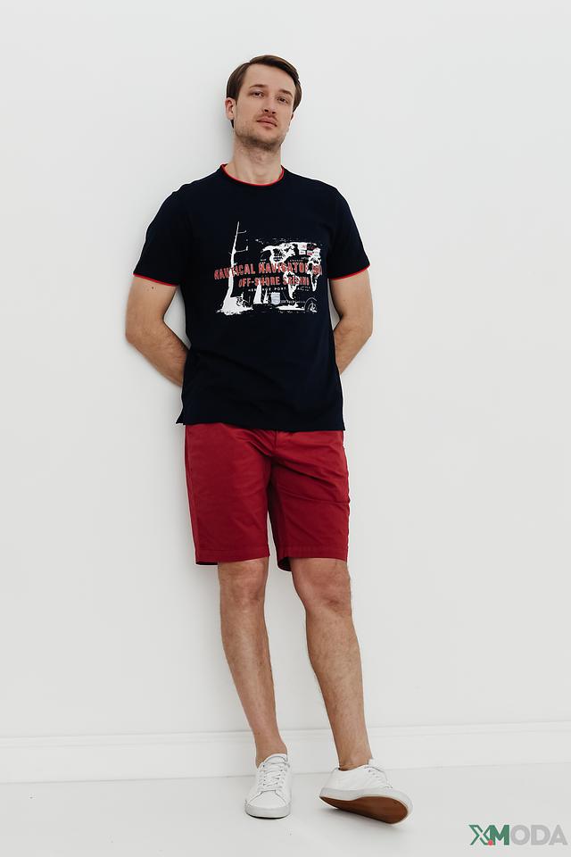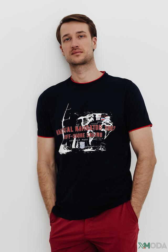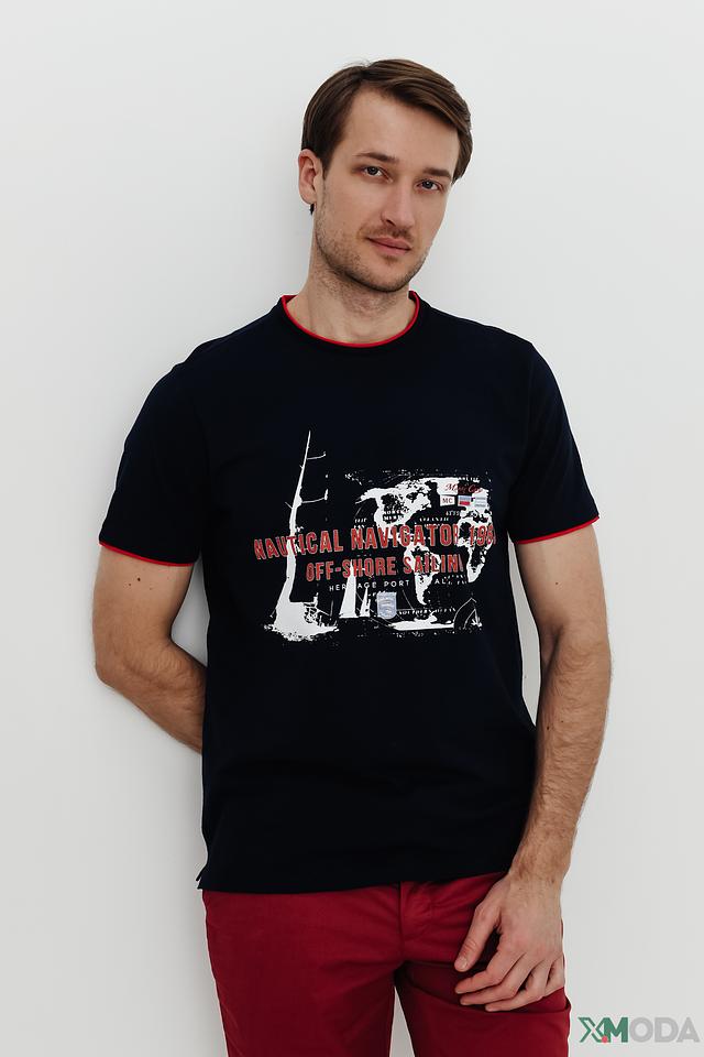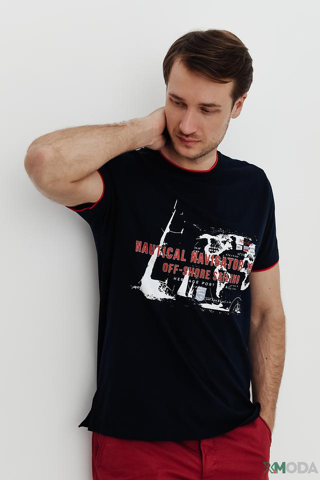 Основной цвет футболки – тёмно-синий, который прекрасно сочетается с различными оттенками. Главной особенностью является яркий принт на лицевой стороне, выполненный в морской тематике с использованием белых, красных и серых оттенков. Принт изображает парусник и надпись "NAUTICAL NAVIGATOR".