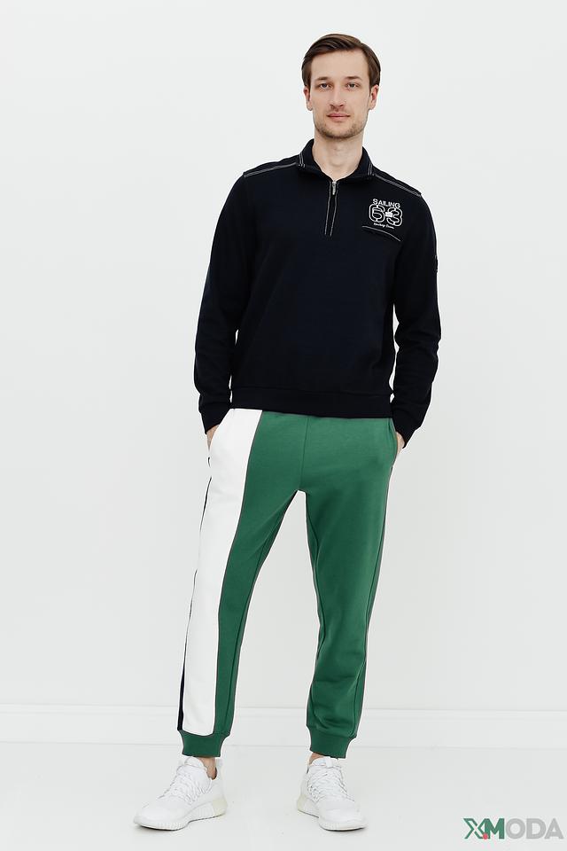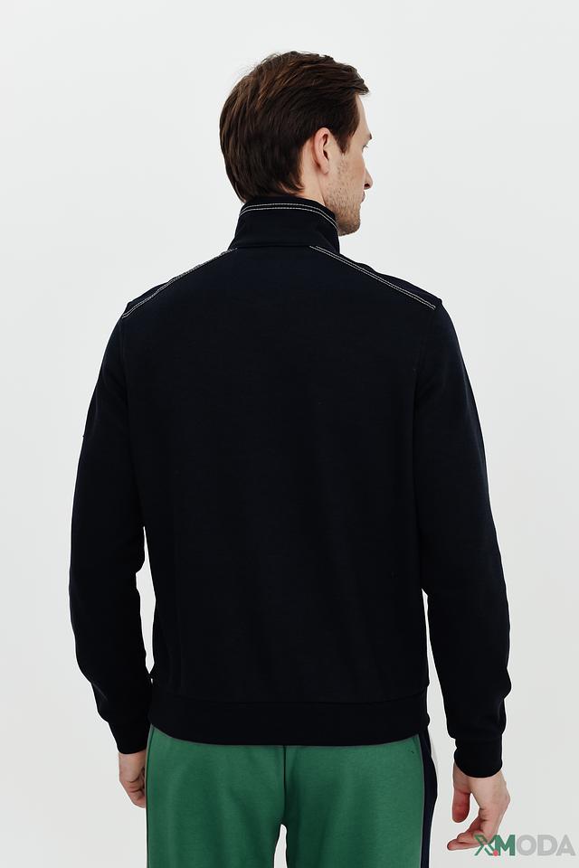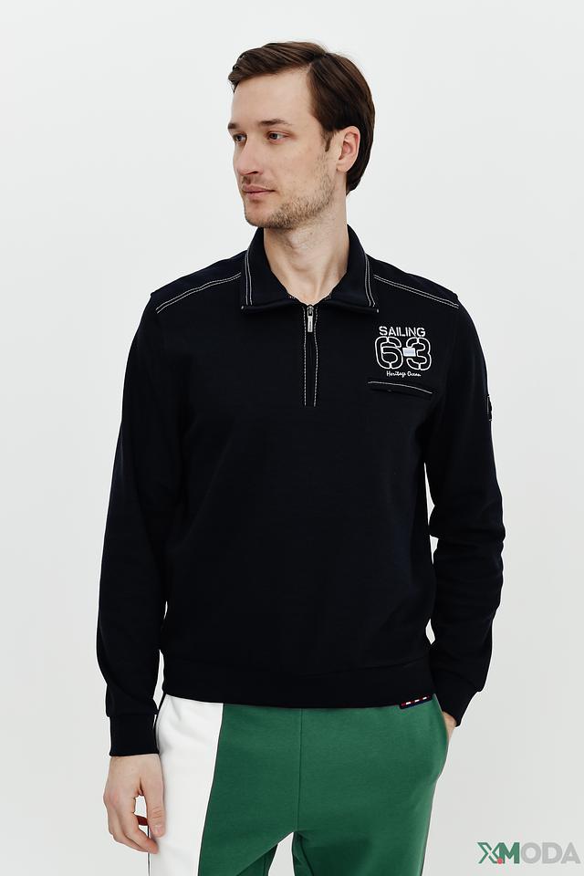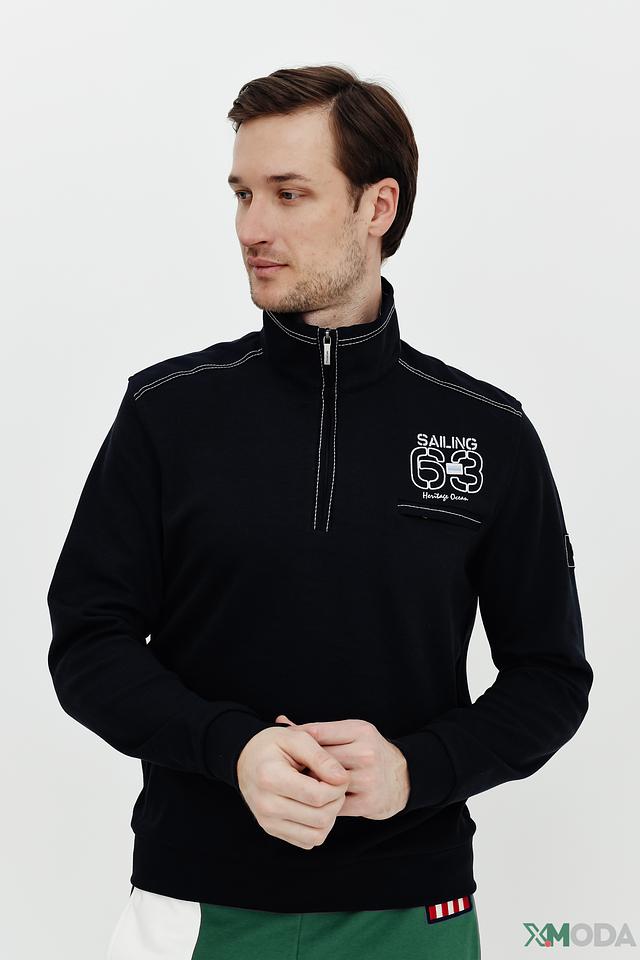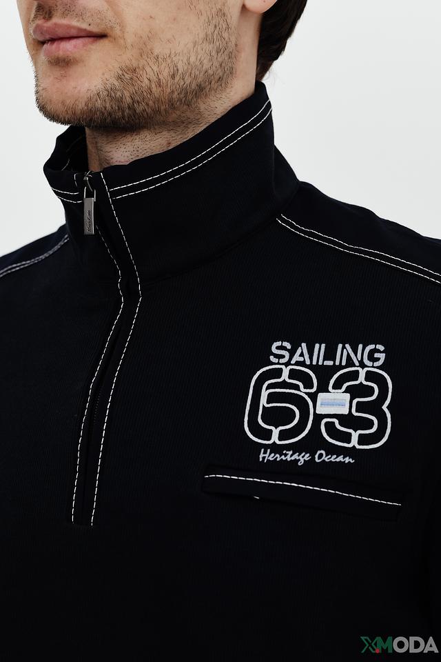 Модель выполнена в классическом чёрном цвете, который легко сочетается с различными элементами гардероба. Джемпер имеет воротник-стойку и короткую молнию, добавляющие динамичности образу. На груди расположена декоративная вышивка "SAILING 63" с логотипом, которая придает изделию индивидуальность.