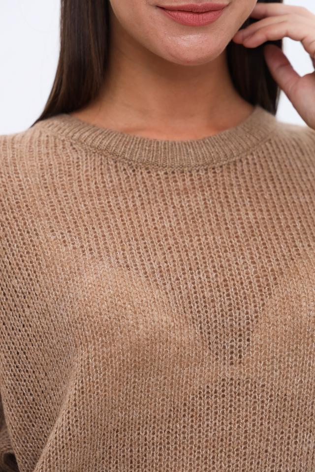 Пуловер имеет свободный крой, короткий рукав и округлый вырез горловины. Текстура вязки придает изделию объем и оригинальность. Благодаря нейтральному бежевому цвету, пуловер легко сочетается с различными элементами одежды и аксессуарами.