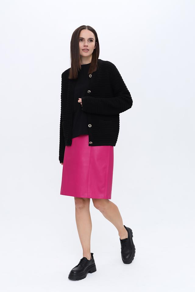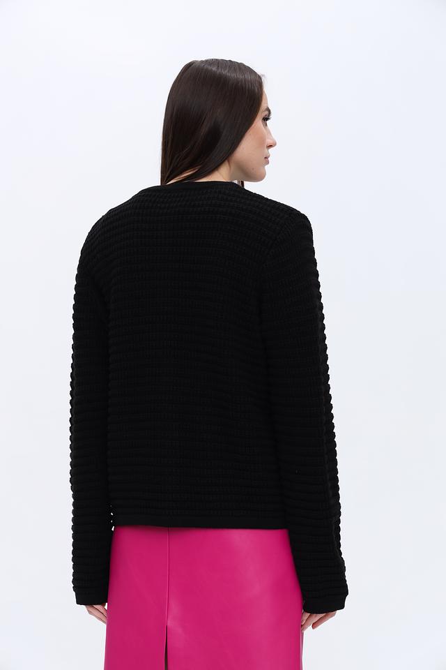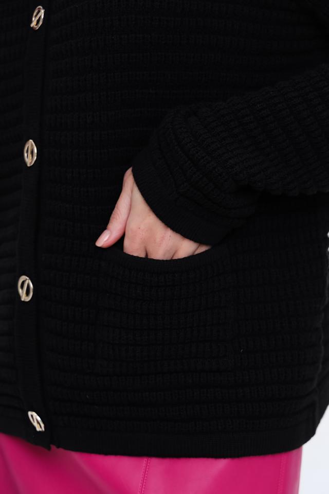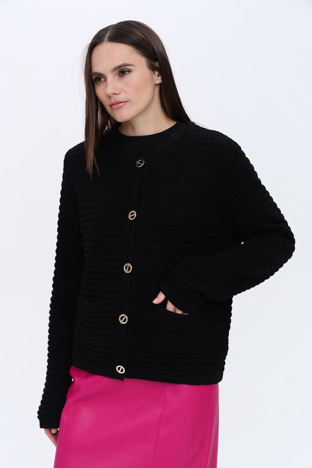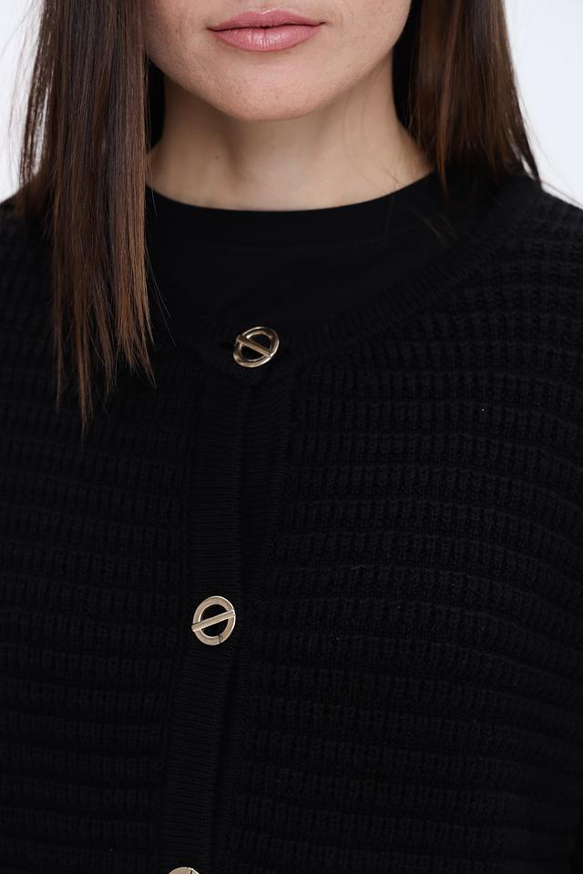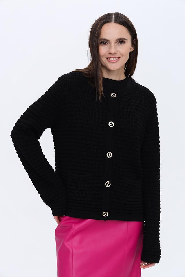 Модель имеет вязаную фактуру, которая придает ей особый шарм и объём. Застёжка на пуговицы позволяет регулировать степень прилегания и создавать разные силуэты.