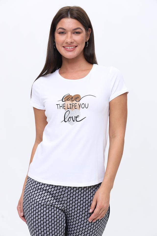 Футболка имеет классический крой с короткими рукавами и круглым вырезом горловины. Главная особенность модели – стильный принт с надписью "live THE LIFE YOU love" и изображением сердца, выполненный в чёрно-золотистой гамме.