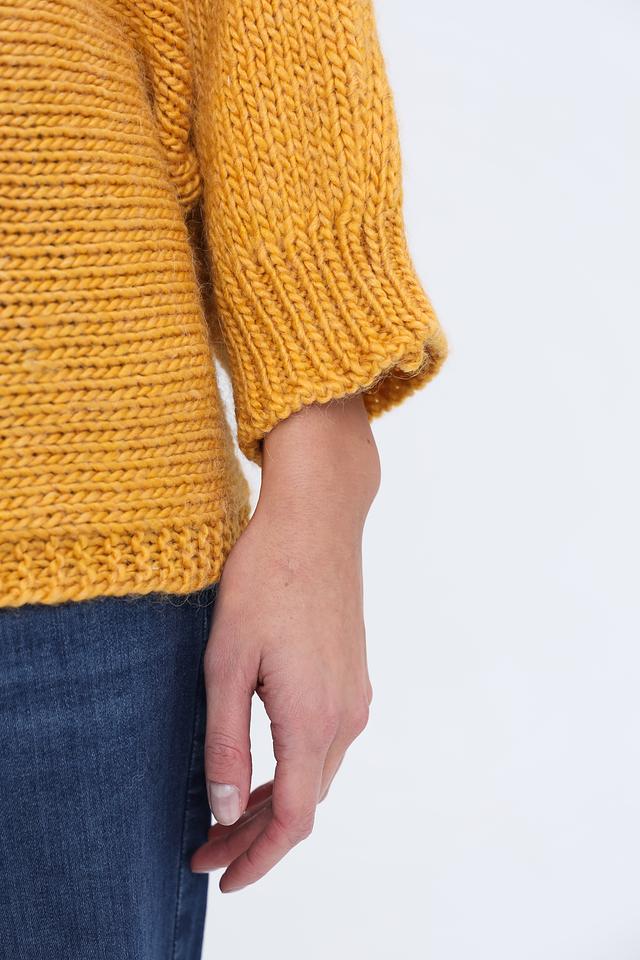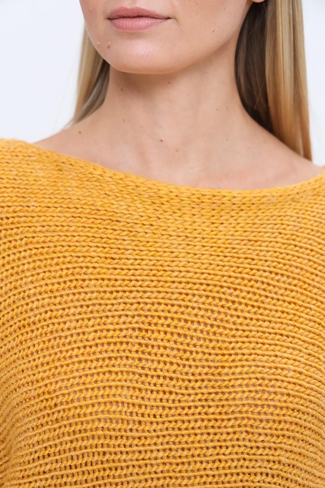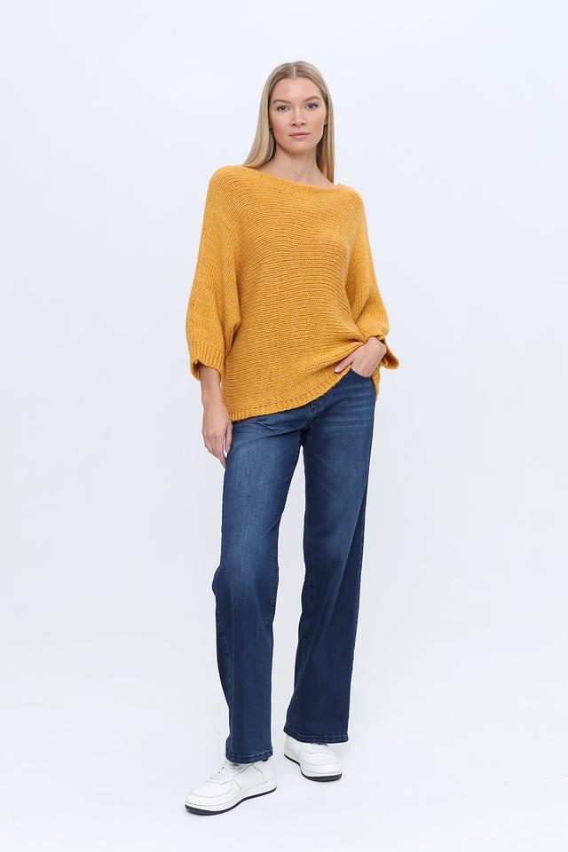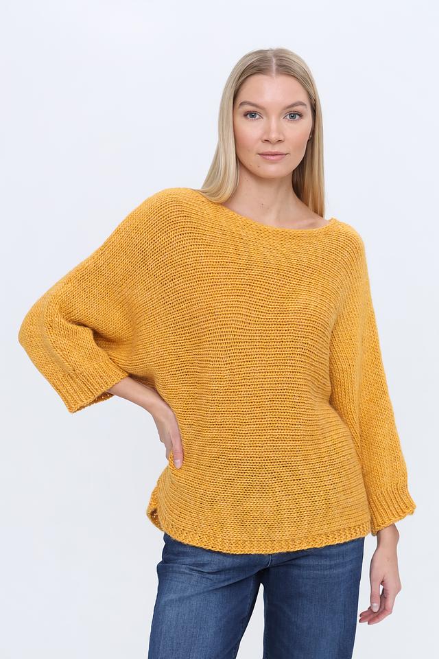 Пуловер имеет свободный крой, который не сковывает движения и позволяет создать расслабленный образ. Рукава-фонарики добавляют изделию женственности и оригинальности. Горчичный цвет пуловера универсален и легко сочетается с другими цветами и стилями одежды.