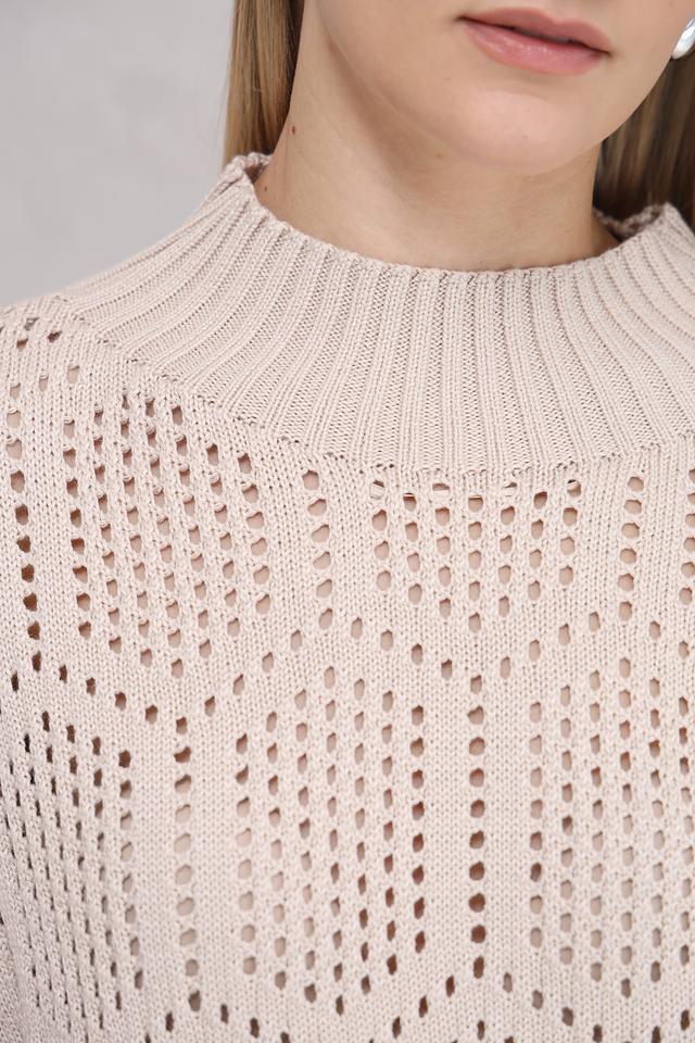 Особенностью данного пуловера является ажурная вязка, которая придает ему легкость и воздушность. Высокий воротник добавляет элегантности и позволяет создавать разнообразные комбинации с другими элементами гардероба.