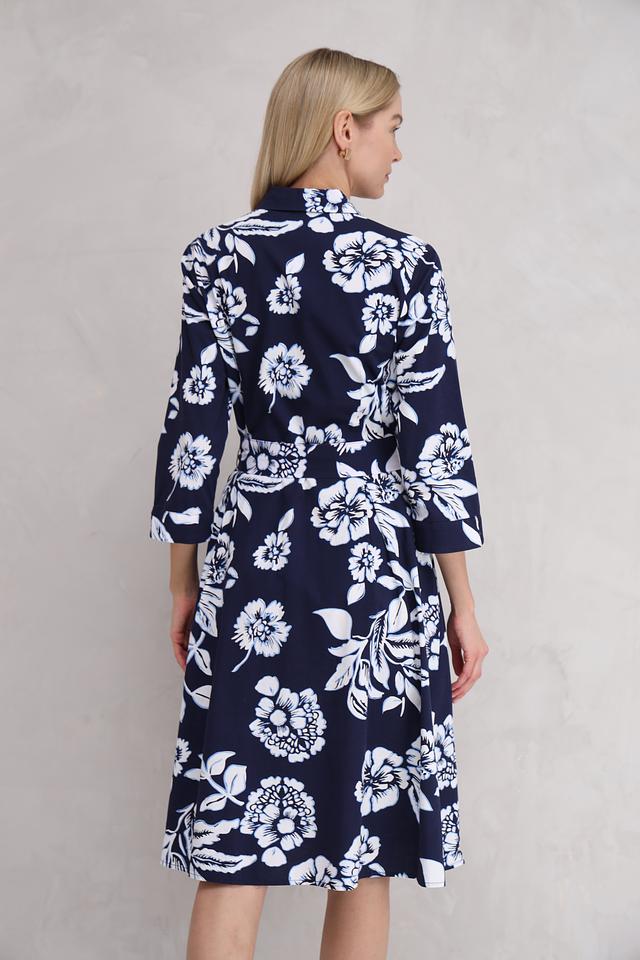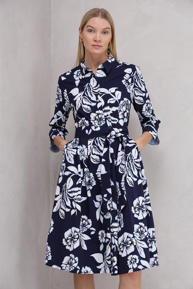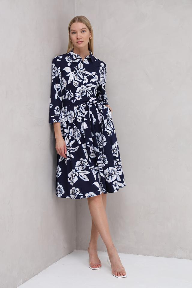 Платье More and More темно-синего цвета с ярким цветочным принтом – идеальный выбор для создания женственного и стильного образа. Модель с воротником-стойкой, рукавами 3/4 и поясом подчеркивает талию и создает элегантный силуэт. Состав: хлопок 97%, эластан 3%