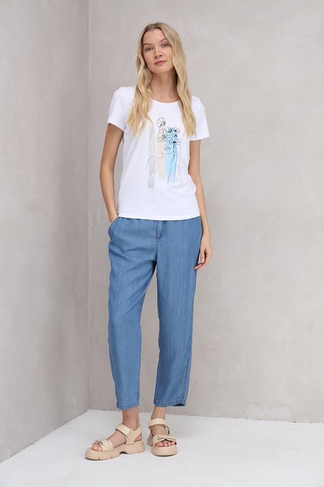 Белая футболка от MORE and MORE с оригинальным принтом в виде абстрактного изображения лица и цветов. Изготовлена из мягкого и приятного к телу сочетания хлопка, модала и эластана, обеспечивающего комфорт при носке. Состав: хлопок 48%, модал 48%, эластан 4%