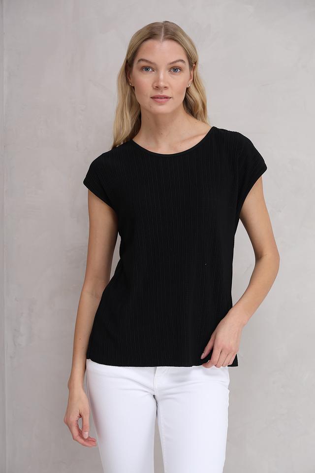 Чёрная футболка от MORE and MORE из 100% полиэстера. Модель с коротким рукавом и круглым вырезом горловины, имеет текстурированную поверхность. Идеально подходит для создания повседневных образов. Состав: полиэстер 100%
