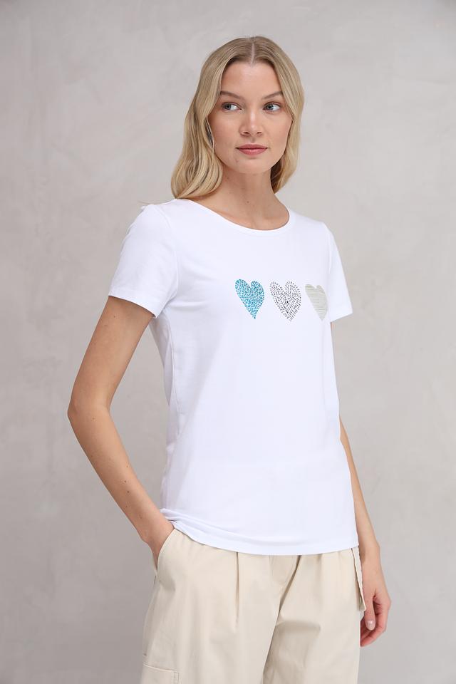 Белая футболка More and More с декоративными сердцами — стильная и комфортная базовая вещь. Изготовлена из мягкого хлопка с модалом и эластаном, обеспечивающим удобную посадку. Состав: хлопок 48%, модал 48%, эластан 4%