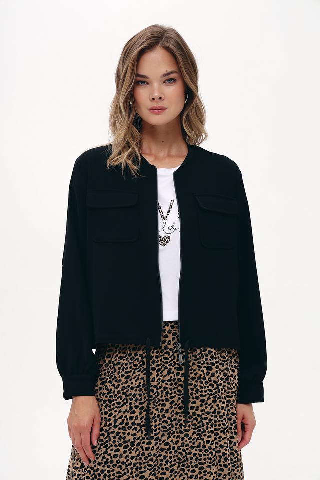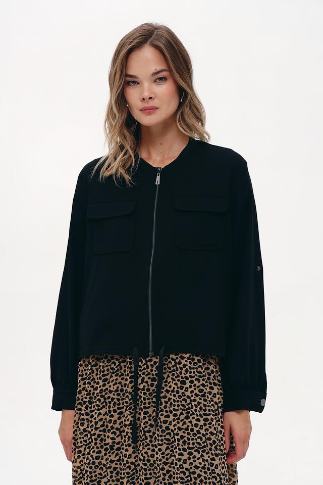 Жакет имеет удобную застёжку на молнию, а также два функциональных кармана. Крой модели обеспечивает комфортную посадку по фигуре, а рукава с манжетами добавляют образу завершенности.