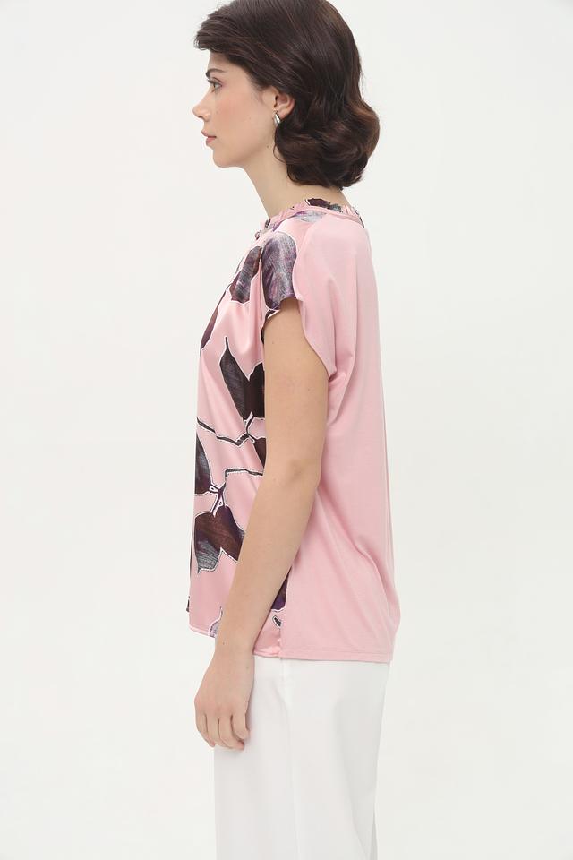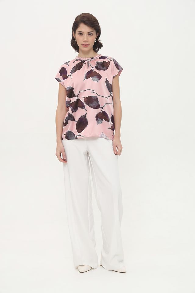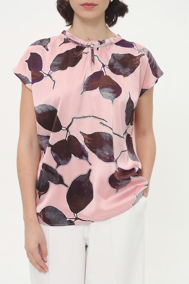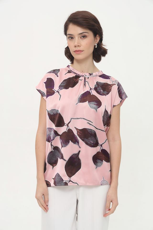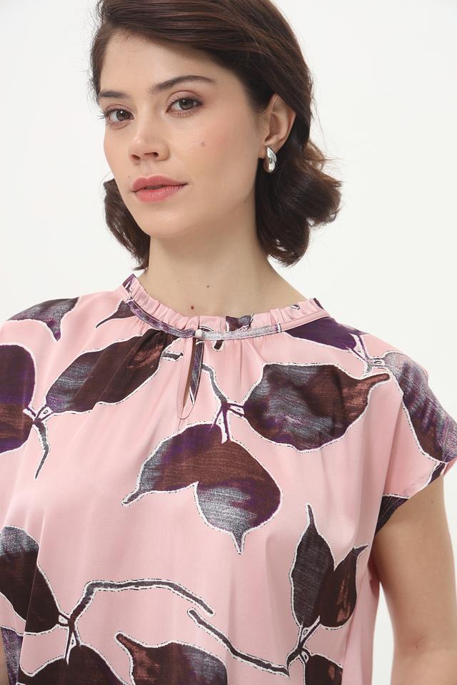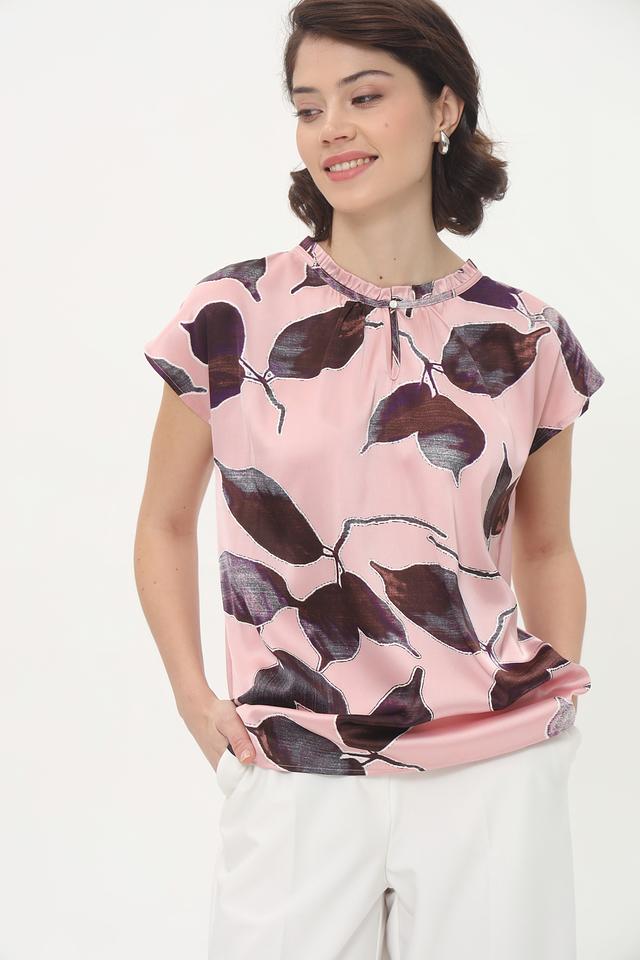 Блуза имеет свободный крой, короткие рукава и округлый вырез горловины, который дополнен небольшим сборкой и декоративной петлей. Основной цвет блузы – нежно-розовый, а принт выполнен в виде стилизованных листьев бордового и коричневого оттенков.