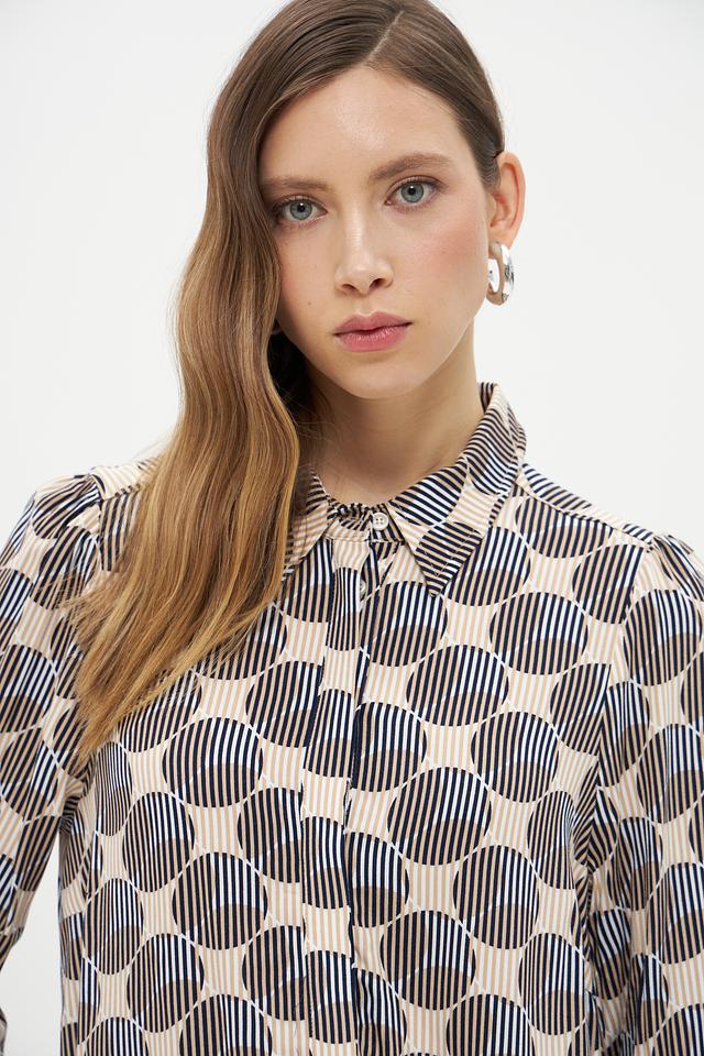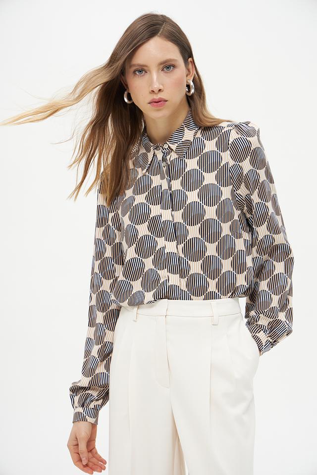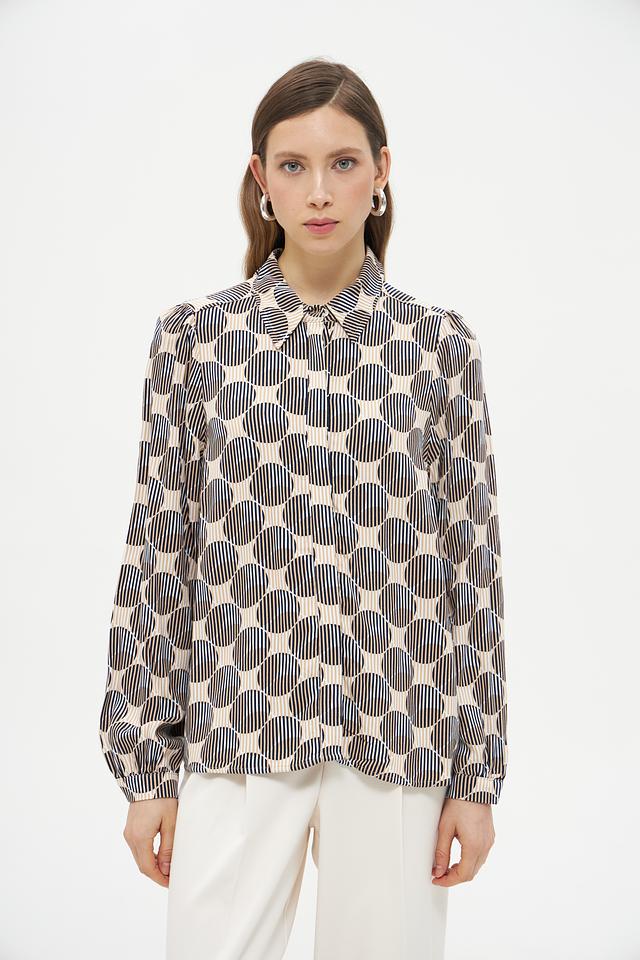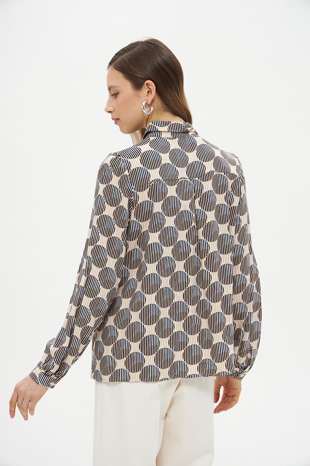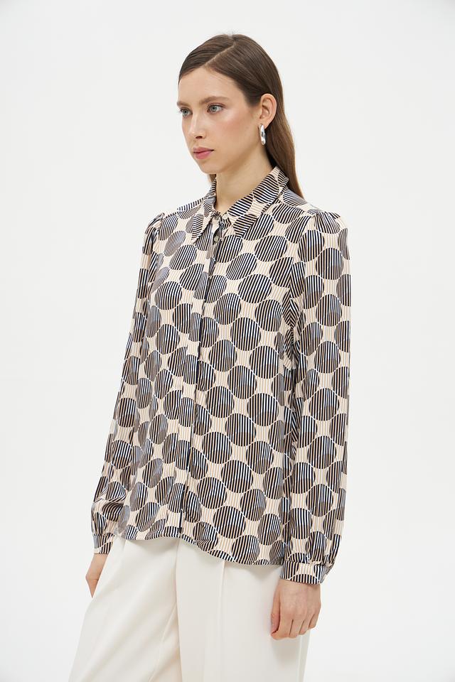 Особенностью модели является оригинальный геометрический принт, сочетающий в себе оттенки бежевого, кремового и тёмно-синего. Воротник-стойка с завязками добавляет изысканности, а рукава с манжетами и небольшими сборками придают блузке лёгкость и воздушность.