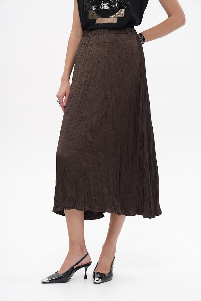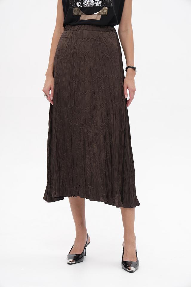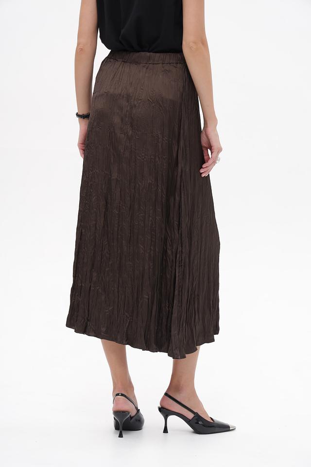 Юбка имеет классическую длину миди и эффектную плиссированную текстуру, которая придает ей изысканность и женственность. Коричневый цвет делает эту модель универсальной и легко сочетаемой с различными элементами одежды.