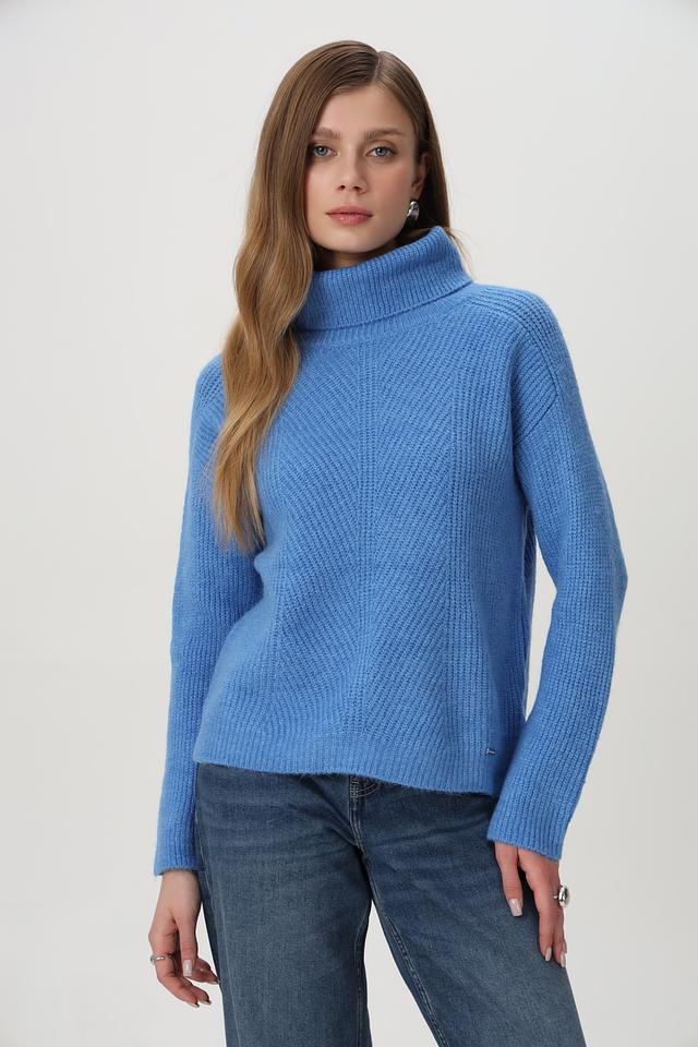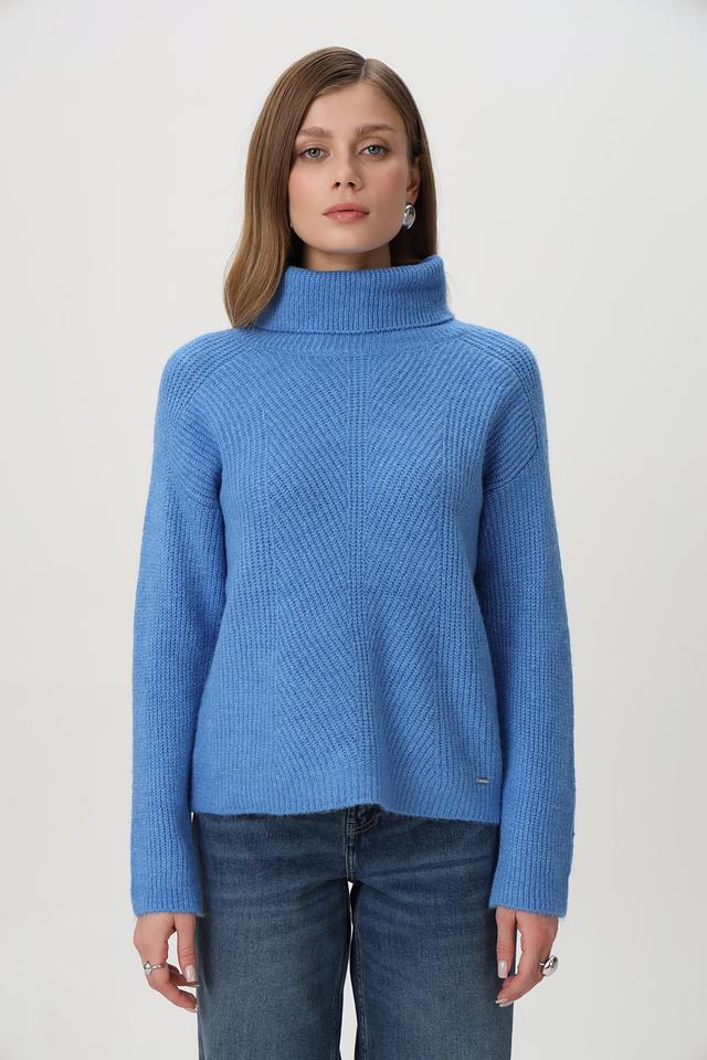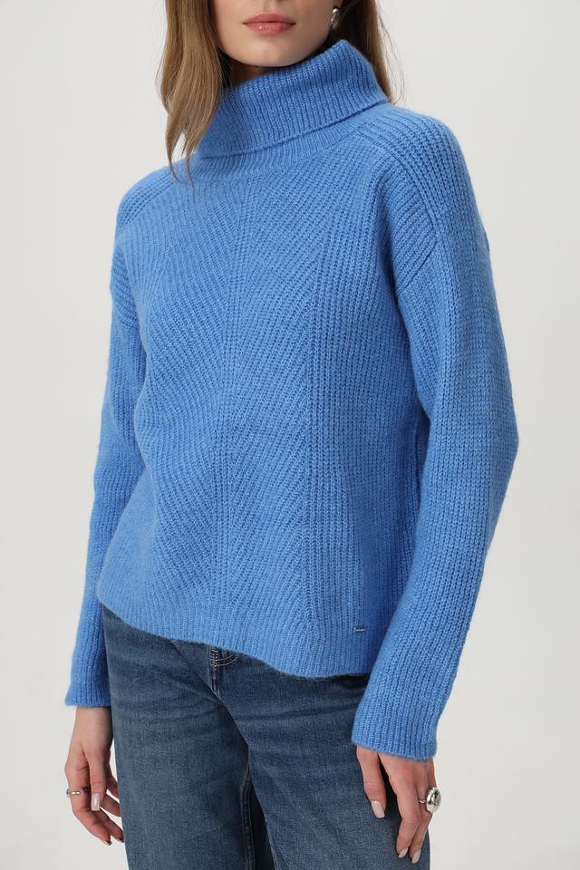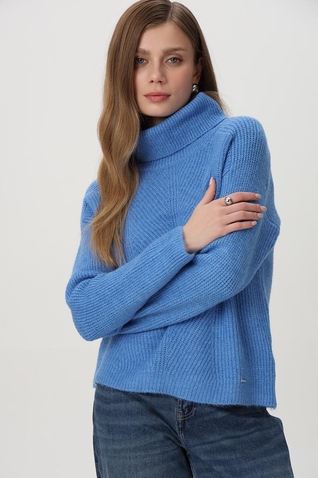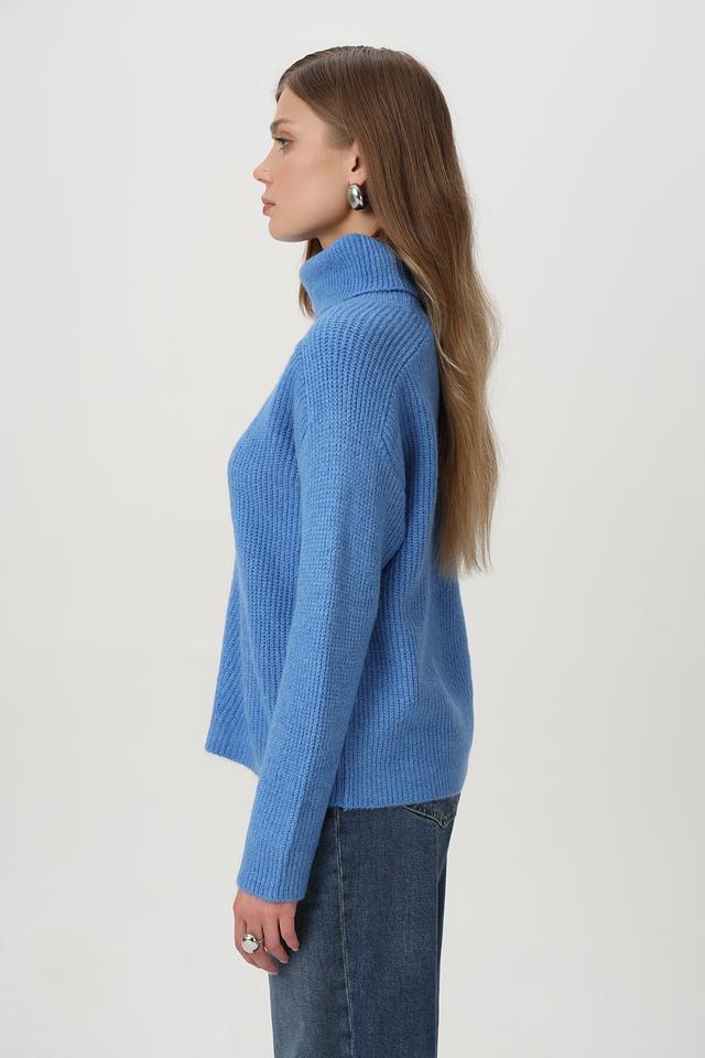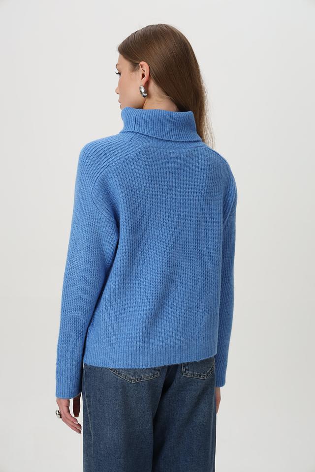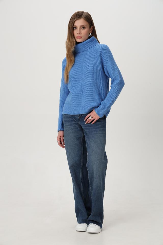 Модель имеет классический крой с высоким горлом и длинными рукавами. Фактурная вязка придает пуловеру объем и оригинальность. Голубой цвет делает его универсальным и легко сочетаемым с другими элементами одежды.
