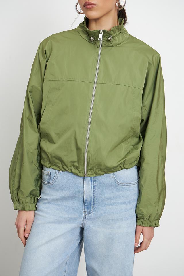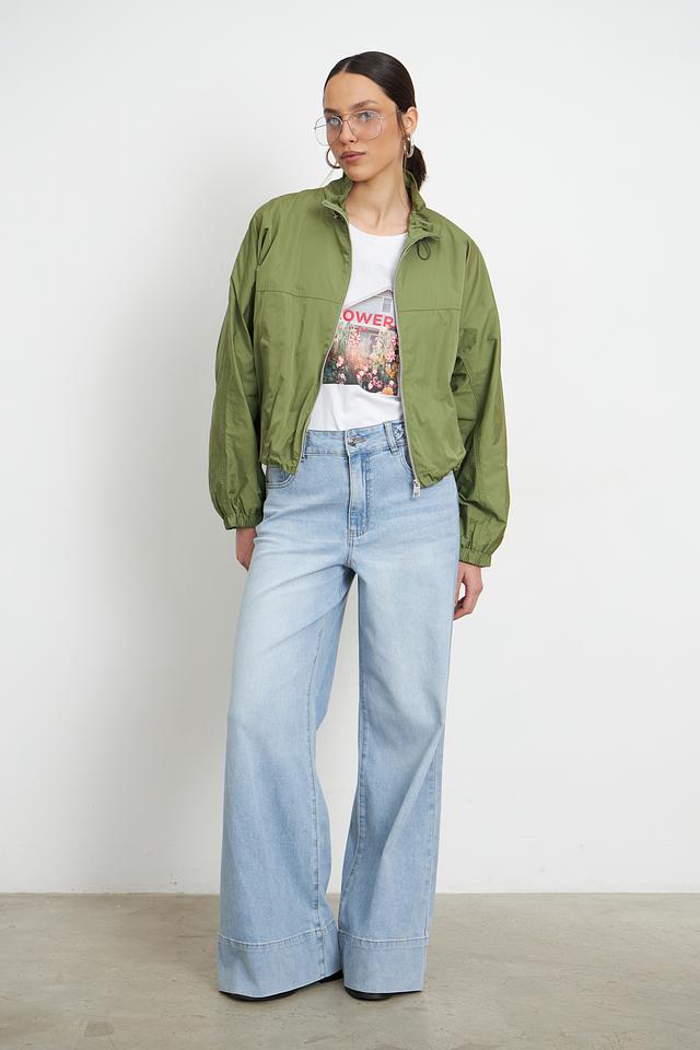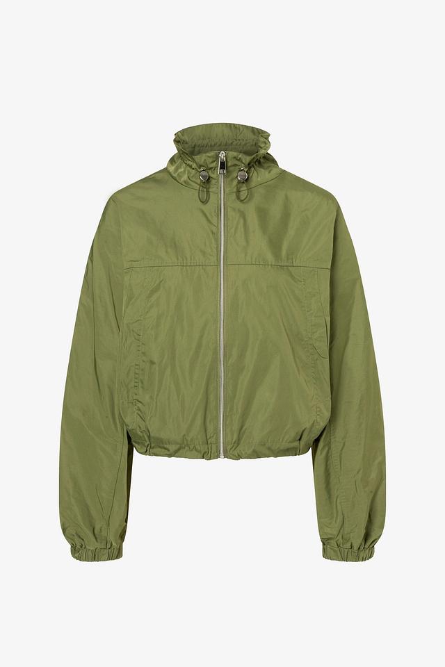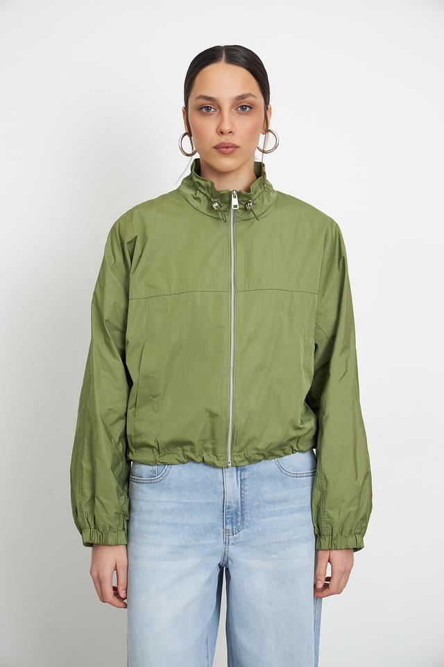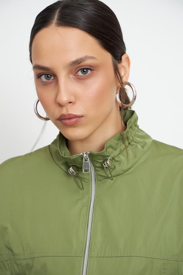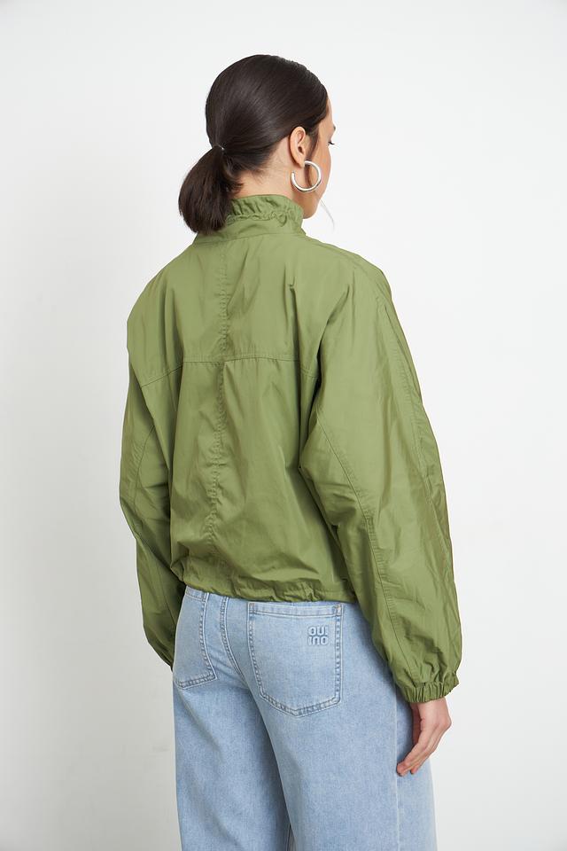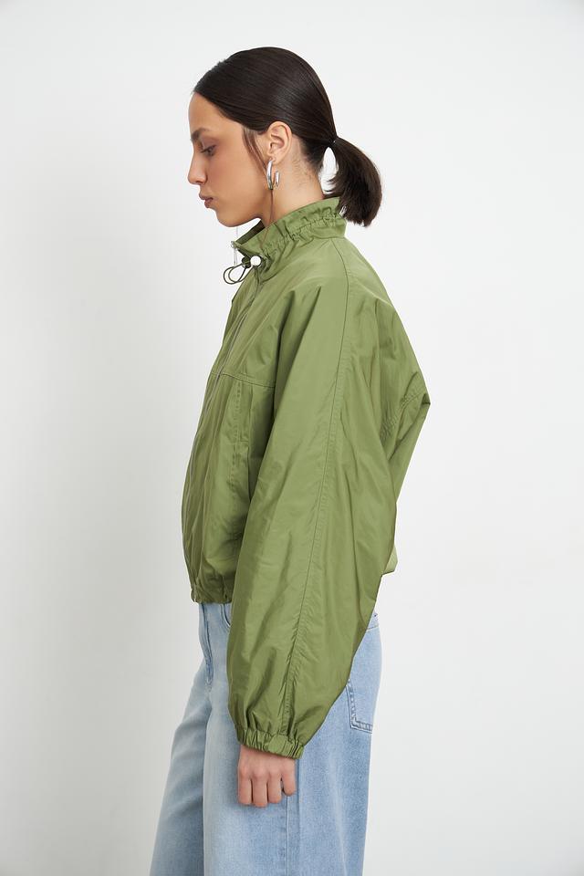 Куртка застегивается на молнию, а воротник-стойка дополнен кулиской с фиксаторами. Рукава куртки широкие, с манжетами на резинке, что позволяет регулировать их длину и посадку. По низу куртки также предусмотрена резинка, создающая слегка присобранный силуэт.