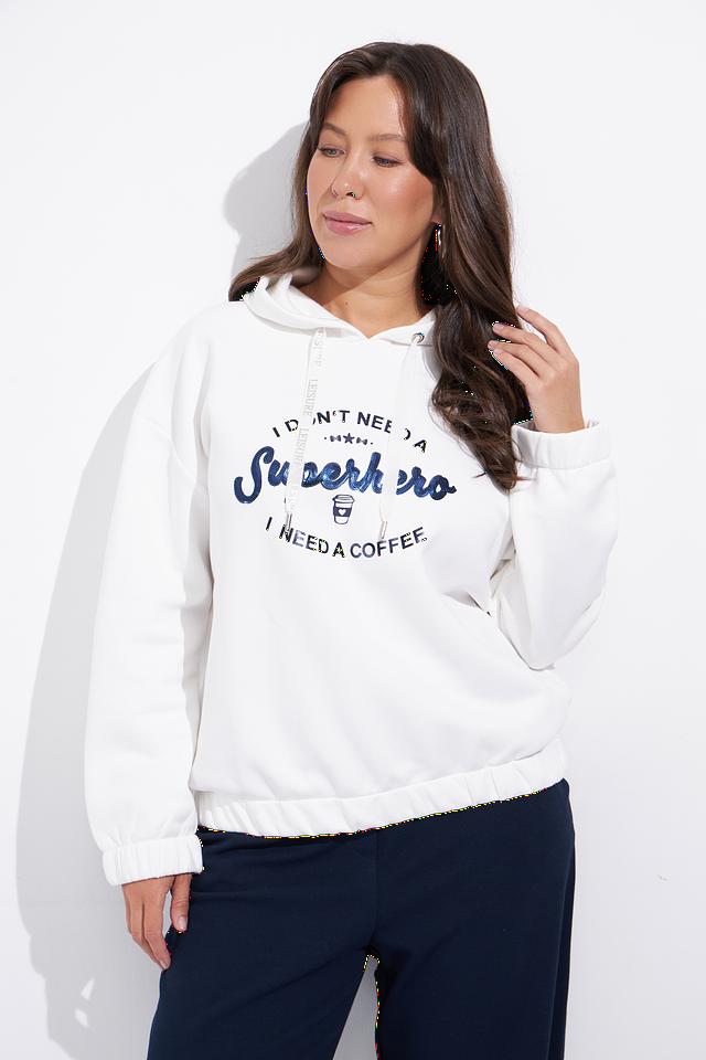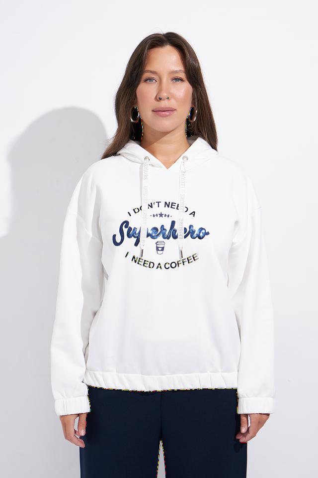 Этот стильный худи от MORE and MORE станет отличным дополнением к вашему гардеробу. Выполненный в белом цвете, он украшен оригинальным принтом с надписью "I don't need a superhero, I need a coffee", что придаёт ему игривый и современный вид.