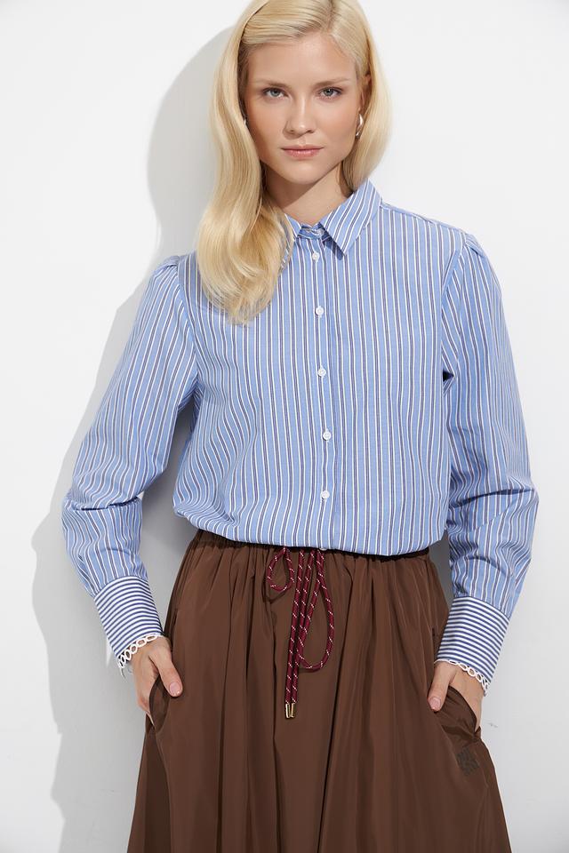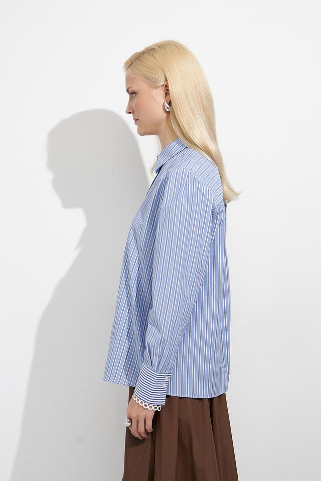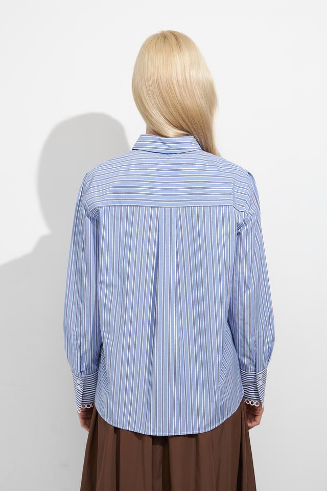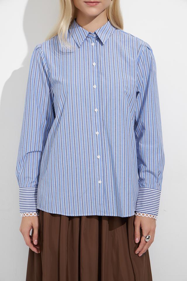 Блуза имеет классический крой и оформлена в стильную полоску голубого цвета. Длинные рукава с манжетами и отложной воротник придают ей элегантный вид. Застежка на пуговицы обеспечивает удобство носки.